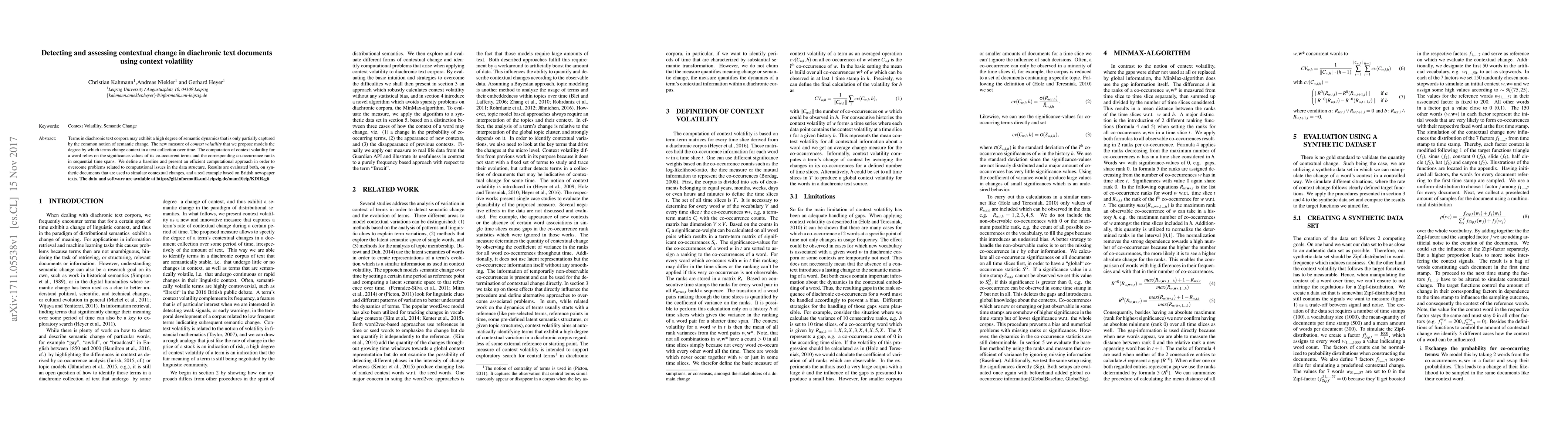 Researchers developed a new measure of context volatility to detect changes in word meanings over time in diachronic text documents, evaluating it on synthetic and real-world texts.