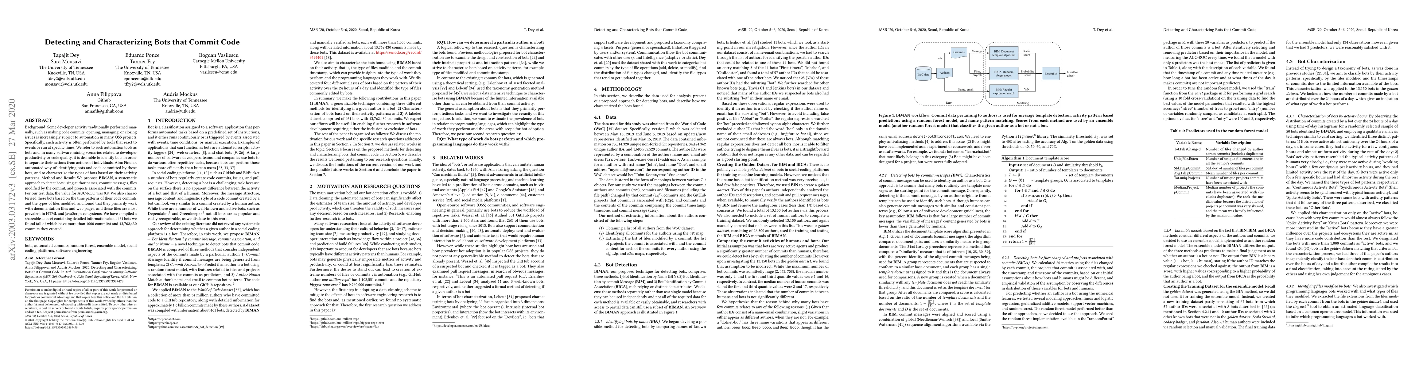 Researchers develop BIMAN to identify bots in open-source projects by analyzing author names, commit messages, and file modifications, achieving an AUC-ROC score of 0.9. The study characterizes bot behavior and finds they primarily work with documentation files in HTML and JavaScript ecosystems.