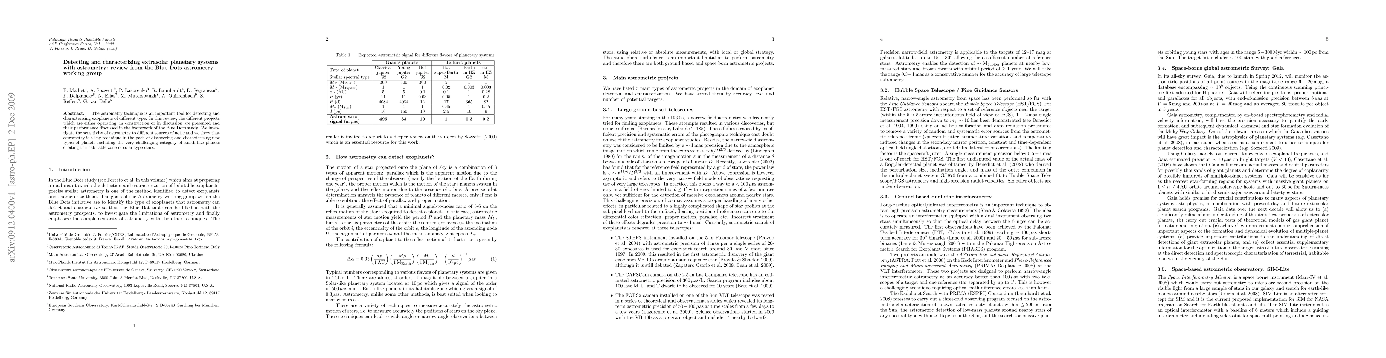 The astrometry technique is an important tool for detecting and characterizing exoplanets of different type. In this review, the different projects which are either operating, in construction or in discussion are presented and their performance discussed in the framework of the Blue Dots study. We investigate the sensitivity of astrometry to different sources of noise and we show that astrometry is a key technique in the path of discovering and characterizing new types of planets including the very challenging category of Earth-like planets orbiting the habitable zone of solar-type stars.