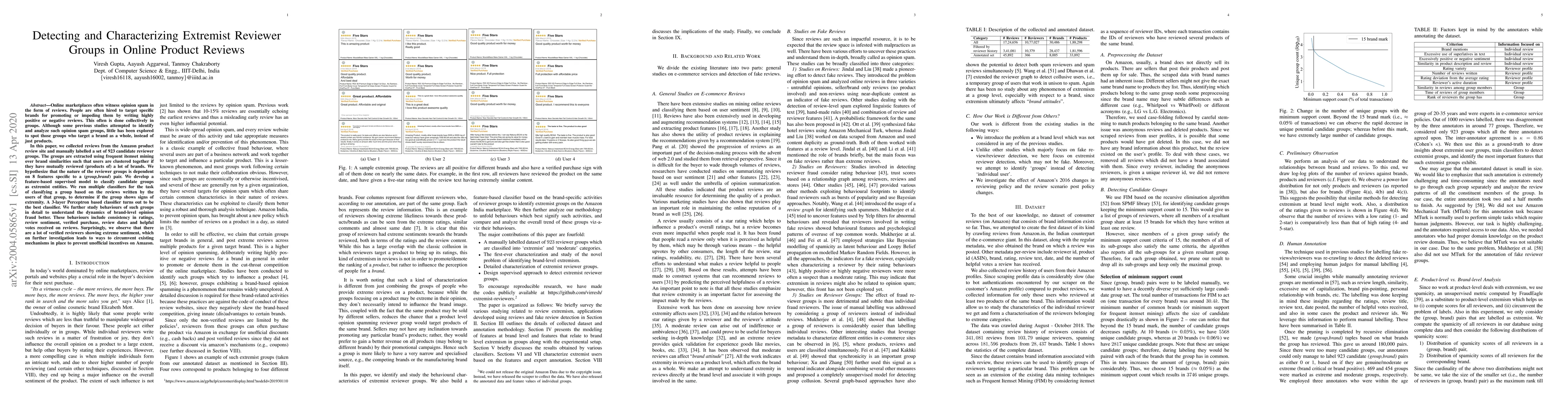 Online marketplaces often witness opinion spam in the form of reviews. People are often hired to target specific brands for promoting or impeding them by writing highly positive or negative reviews. This often is done collectively in groups. Although some previous studies attempted to identify and analyze such opinion spam groups, little has been explored to spot those groups who target a brand as a whole, instead of just products. In this paper, we collected reviews from the Amazon product review site and manually labelled a set of 923 candidate reviewer groups. The groups are extracted using frequent itemset mining over brand similarities such that users are clustered together if they have mutually reviewed (products of) a lot of brands. We hypothesize that the nature of the reviewer groups is dependent on 8 features specific to a (group, brand) pair. We develop a feature-based supervised model to classify candidate groups as extremist entities. We run multiple classifiers for the task of classifying a group based on the reviews written by the users of that group, to determine if the group shows signs of extremity. A 3-layer Perceptron based classifier turns out to be the best classifier. We further study the behaviours of such groups in detail to understand the dynamics of brand-level opinion fraud better. These behaviours include consistency in ratings, review sentiment, verified purchase, review dates and helpful votes received on reviews. Surprisingly, we observe that there are a lot of verified reviewers showing extreme sentiment, which on further investigation leads to ways to circumvent existing mechanisms in place to prevent unofficial incentives on Amazon.