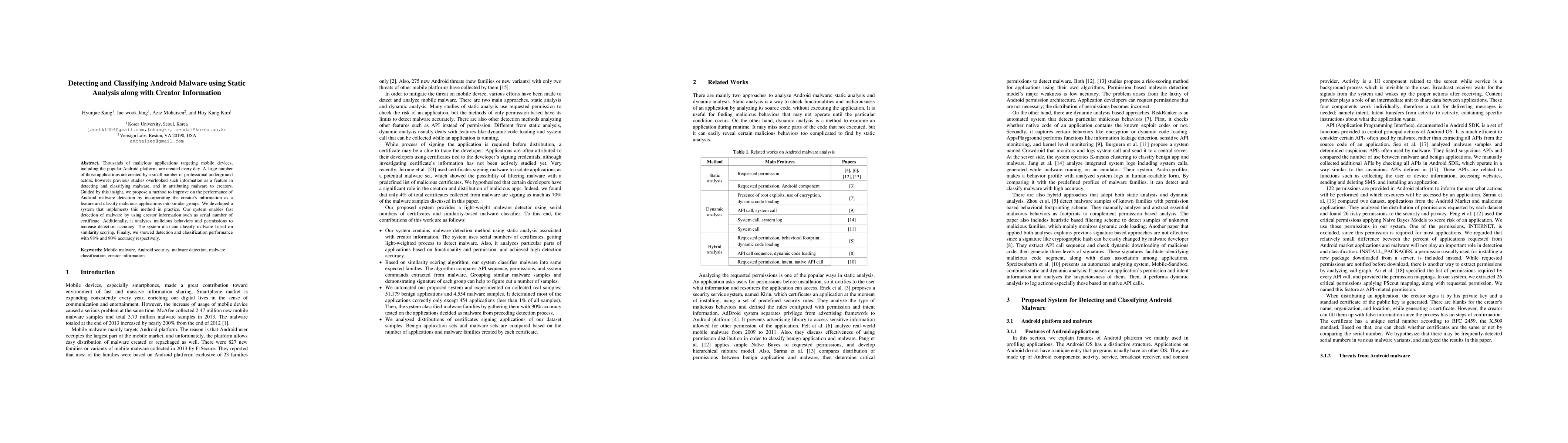 This paper proposes a method to enhance Android malware detection by incorporating the creator's information, such as the serial number of the certificate, as a feature. The developed system achieves 98% accuracy in detection and 90% in classification by analyzing malicious behaviors and permissions.