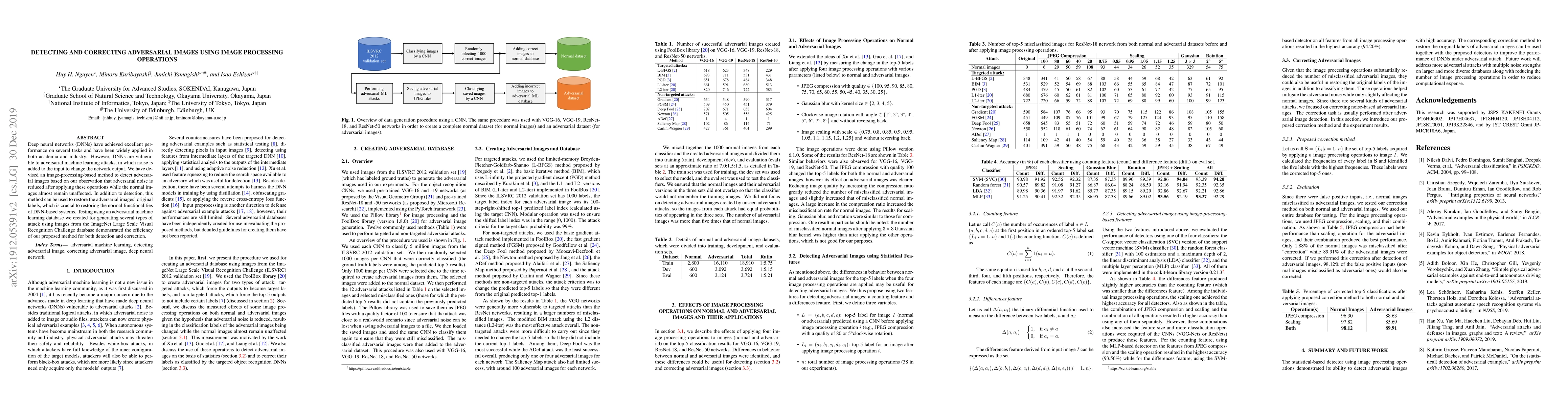 Deep neural networks (DNNs) have achieved excellent performance on several tasks and have been widely applied in both academia and industry. However, DNNs are vulnerable to adversarial machine learning attacks, in which noise is added to the input to change the network output. We have devised an image-processing-based method to detect adversarial images based on our observation that adversarial noise is reduced after applying these operations while the normal images almost remain unaffected. In addition to detection, this method can be used to restore the adversarial images' original labels, which is crucial to restoring the normal functionalities of DNN-based systems. Testing using an adversarial machine learning database we created for generating several types of attack using images from the ImageNet Large Scale Visual Recognition Challenge database demonstrated the efficiency of our proposed method for both detection and correction.