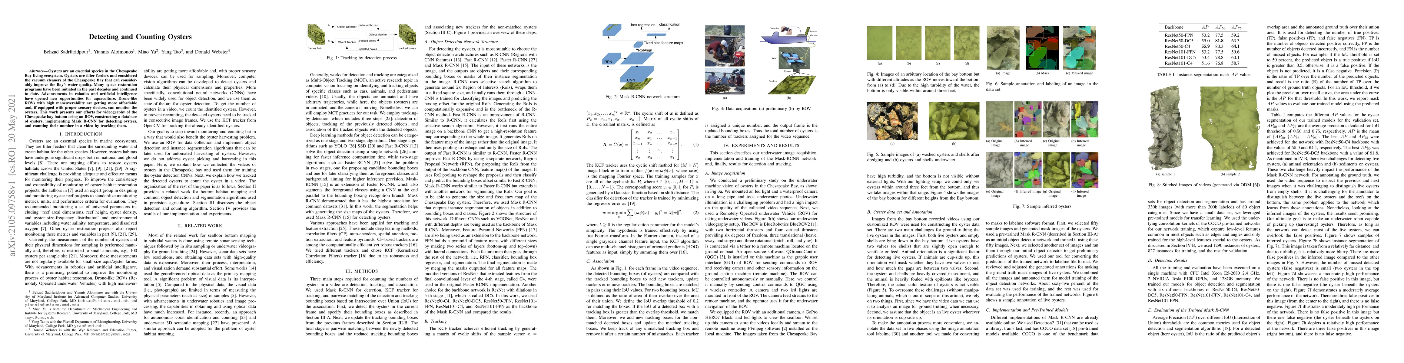 Oysters are an essential species in the Chesapeake Bay living ecosystem. Oysters are filter feeders and considered the vacuum cleaners of the Chesapeake Bay that can considerably improve the Bay's water quality. Many oyster restoration programs have been initiated in the past decades and continued to date. Advancements in robotics and artificial intelligence have opened new opportunities for aquaculture. Drone-like ROVs with high maneuverability are getting more affordable and, if equipped with proper sensory devices, can monitor the oysters. This work presents our efforts for videography of the Chesapeake bay bottom using an ROV, constructing a database of oysters, implementing Mask R-CNN for detecting oysters, and counting their number in a video by tracking them.