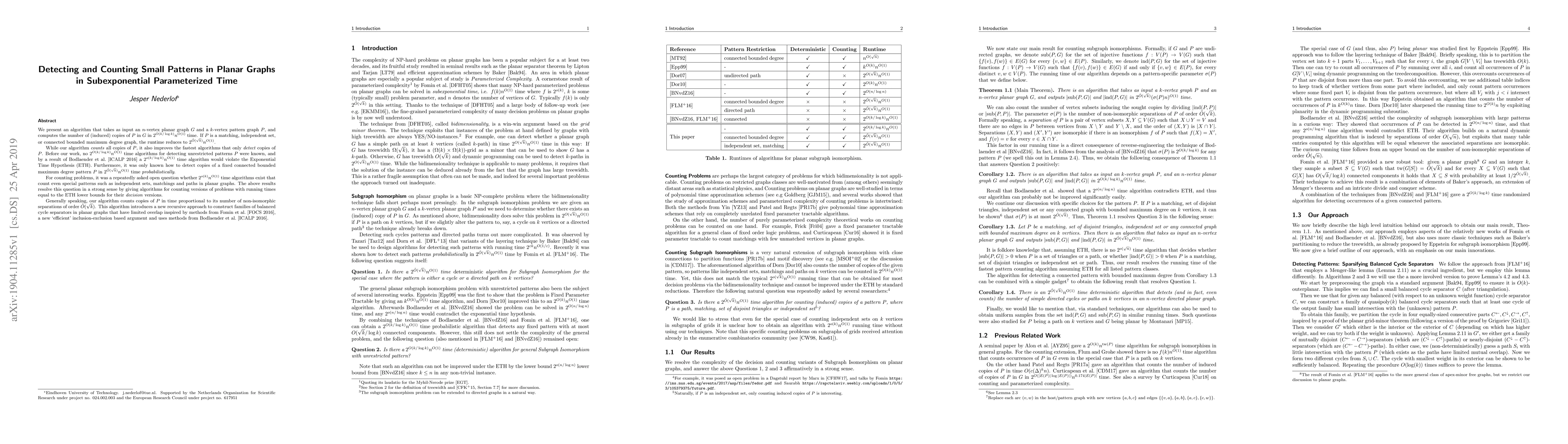 We present an algorithm that takes as input an $n$-vertex planar graph $G$ and a $k$-vertex pattern graph $P$, and computes the number of (induced) copies of $P$ in $G$ in $2^{O(k/\log k)}n^{O(1)}$ time. If $P$ is a matching, independent set, or connected bounded maximum degree graph, the runtime reduces to $2^{\tilde{O}(\sqrt{k})}n^{O(1)}$. While our algorithm counts all copies of $P$, it also improves the fastest algorithms that only detect copies of $P$. Before our work, no $2^{O(k/\log k)}n^{O(1)}$ time algorithms for detecting unrestricted patterns $P$ were known, and by a result of Bodlaender et al. [ICALP 2016] a $2^{o(k/\log k)}n^{O(1)}$ time algorithm would violate the Exponential Time Hypothesis (ETH). Furthermore, it was only known how to detect copies of a fixed connected bounded maximum degree pattern $P$ in $2^{\tilde{O}(\sqrt{k})}n^{O(1)}$ time probabilistically. For counting problems, it was a repeatedly asked open question whether $2^{o(k)}n^{O(1)}$ time algorithms exist that count even special patterns such as independent sets, matchings and paths in planar graphs. The above results resolve this question in a strong sense by giving algorithms for counting versions of problems with running times equal to the ETH lower bounds for their decision versions. Generally speaking, our algorithm counts copies of $P$ in time proportional to its number of non-isomorphic separations of order $\tilde{O}(\sqrt{k})$. The algorithm introduces a new recursive approach to construct families of balanced cycle separators in planar graphs that have limited overlap inspired by methods from Fomin et al. [FOCS 2016], a new `efficient' inclusion-exclusion based argument and uses methods from Bodlaender et al. [ICALP 2016].