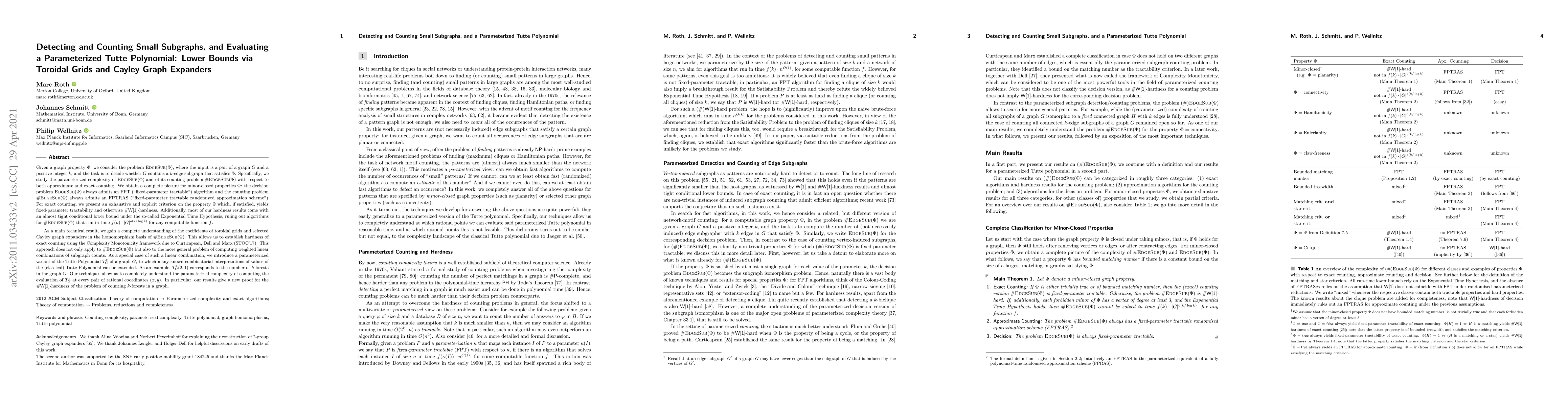 This paper investigates the parameterized complexity of detecting and counting small subgraphs that satisfy a given graph property $\Phi$ and evaluates the parameterized Tutte Polynomial $T^k_G$. It establishes FPT algorithms and FPTRAS for these problems under minor-closed properties, and presents conditional lower bounds for exact counting under the Exponential Time Hypothesis.