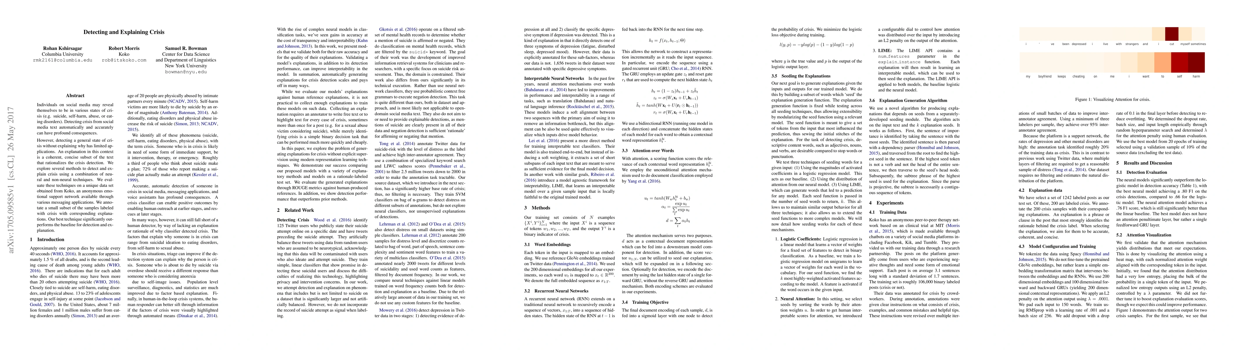 This paper investigates methods for automatically detecting and explaining various states of crisis in social media posts, using both neural and non-neural techniques. The study evaluates these methods on a dataset from Koko, achieving superior results in both detection and providing coherent explanations for the identified crises.