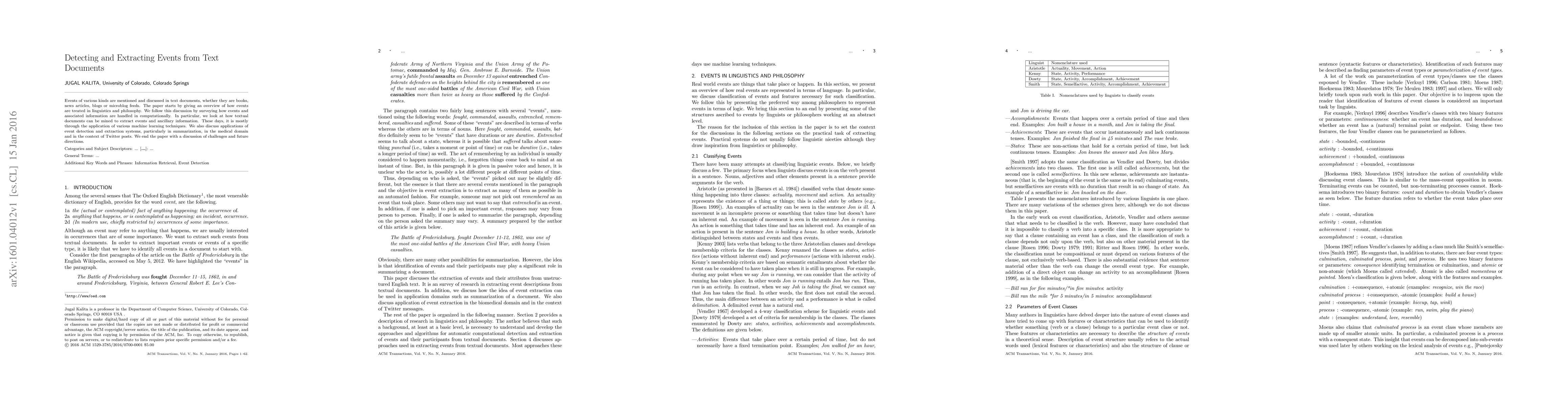This paper reviews the linguistic and computational approaches to detecting and extracting events from text, focusing on machine learning techniques. It highlights applications in summarization, medical texts, and Twitter, and discusses challenges and future research directions.