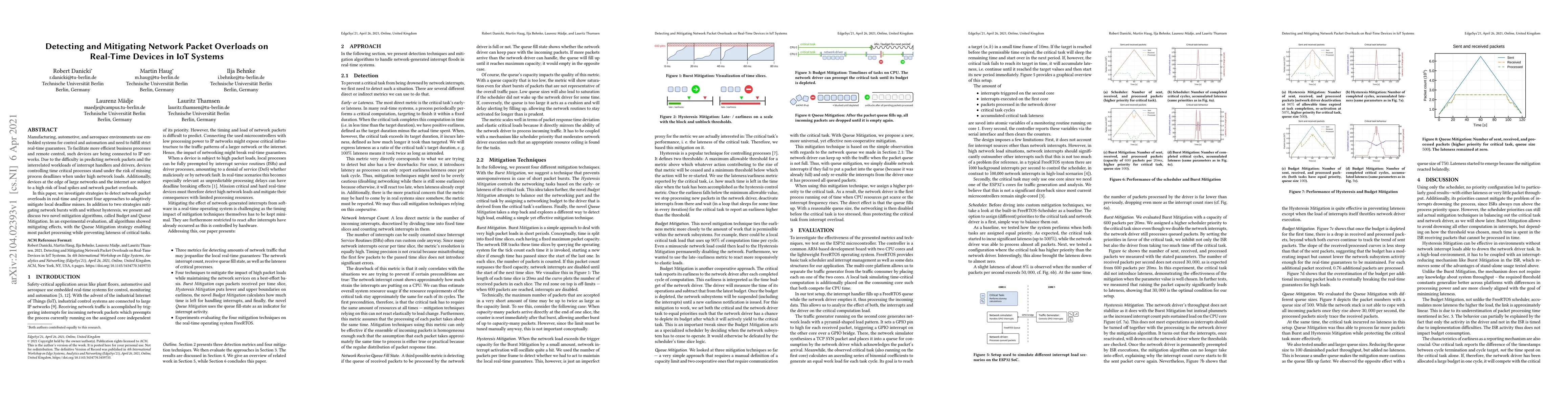 Manufacturing, automotive, and aerospace environments use embedded systems for control and automation and need to fulfill strict real-time guarantees. To facilitate more efficient business processes and remote control, such devices are being connected to IP networks. Due to the difficulty in predicting network packets and the interrelated workloads of interrupt handlers and drivers, devices controlling time critical processes stand under the risk of missing process deadlines when under high network loads. Additionally, devices at the edge of large networks and the internet are subject to a high risk of load spikes and network packet overloads. In this paper, we investigate strategies to detect network packet overloads in real-time and present four approaches to adaptively mitigate local deadline misses. In addition to two strategies mitigating network bursts with and without hysteresis, we present and discuss two novel mitigation algorithms, called Budget and Queue Mitigation. In an experimental evaluation, all algorithms showed mitigating effects, with the Queue Mitigation strategy enabling most packet processing while preventing lateness of critical tasks.