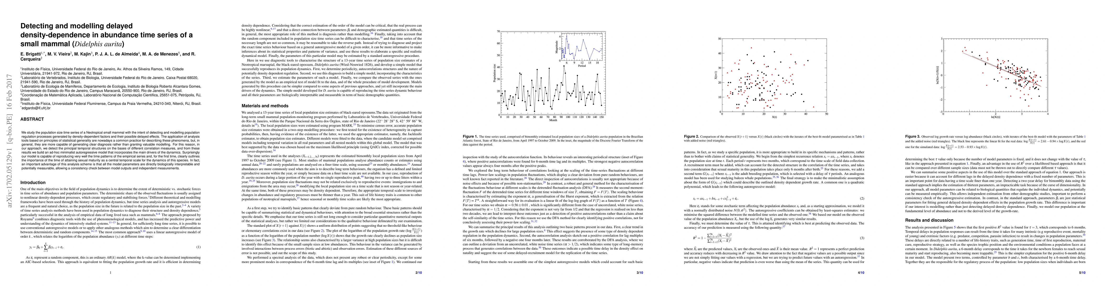 We study the population size time series of a Neotropical small mammal with the intent of detecting and modelling population regulation processes generated by density-dependent factors and their possible delayed effects. The application of analysis tools based on principles of statistical generality are nowadays a common practice for describing these phenomena, but, in general, they are more capable of generating clear diagnosis rather than granting valuable modelling. For this reason, in our approach, we detect the principal temporal structures on the bases of different correlation measures, and from these results we build an ad-hoc minimalist autoregressive model that incorporates the main drivers of the dynamics. Surprisingly our model is capable of reproducing very well the time patterns of the empirical series and, for the first time, clearly outlines the importance of the time of attaining sexual maturity as a central temporal scale for the dynamics of this species. In fact, an important advantage of this analysis scheme is that all the model parameters are directly biologically interpretable and potentially measurable, allowing a consistency check between model outputs and independent measurements.