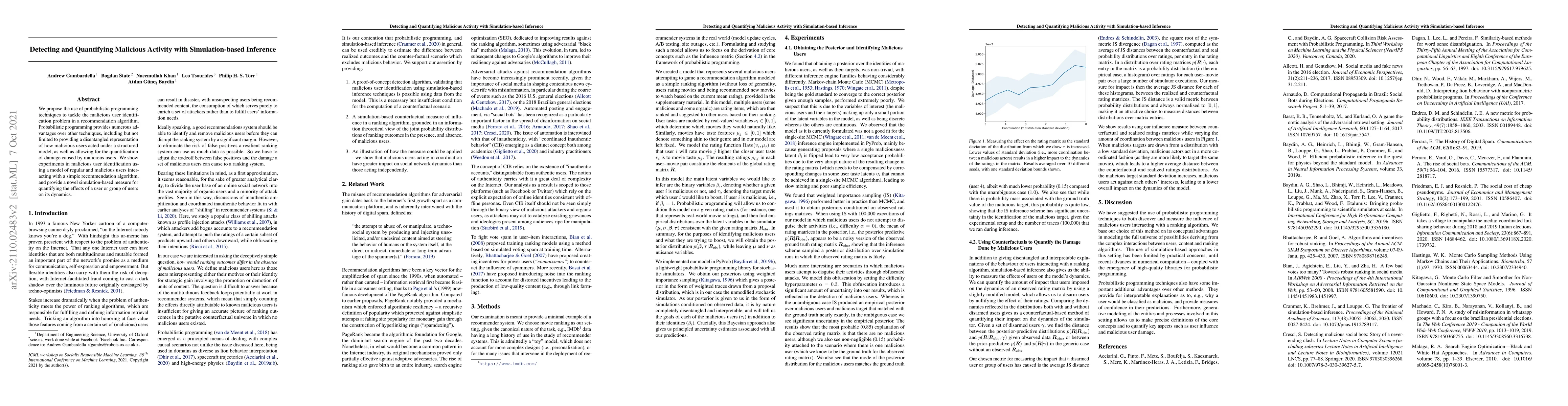 This paper proposes using probabilistic programming to identify malicious users in recommendation algorithms, offering a disentangled model of their actions and a novel simulation-based measure to quantify their impact. Experiments demonstrate the effectiveness of this approach in detecting and assessing malicious behavior.