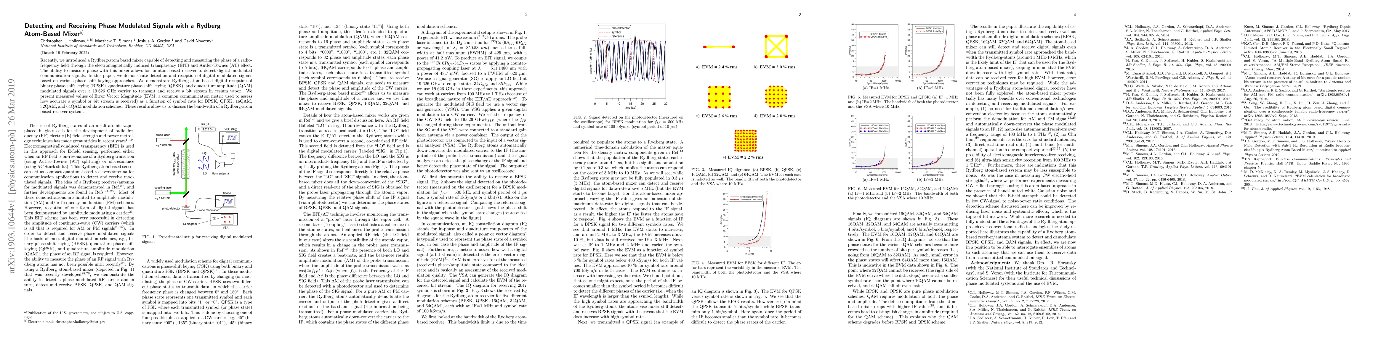 This paper presents a Rydberg-atom based mixer for detecting and measuring phase in radio-frequency signals, enabling the reception of various digital modulated signals including BPSK, QPSK, and QAM over a 19.626 GHz carrier. Measured Error Vector Magnitude values for different modulation schemes provide insights into the bandwidth capabilities of such atom-based receiver systems.