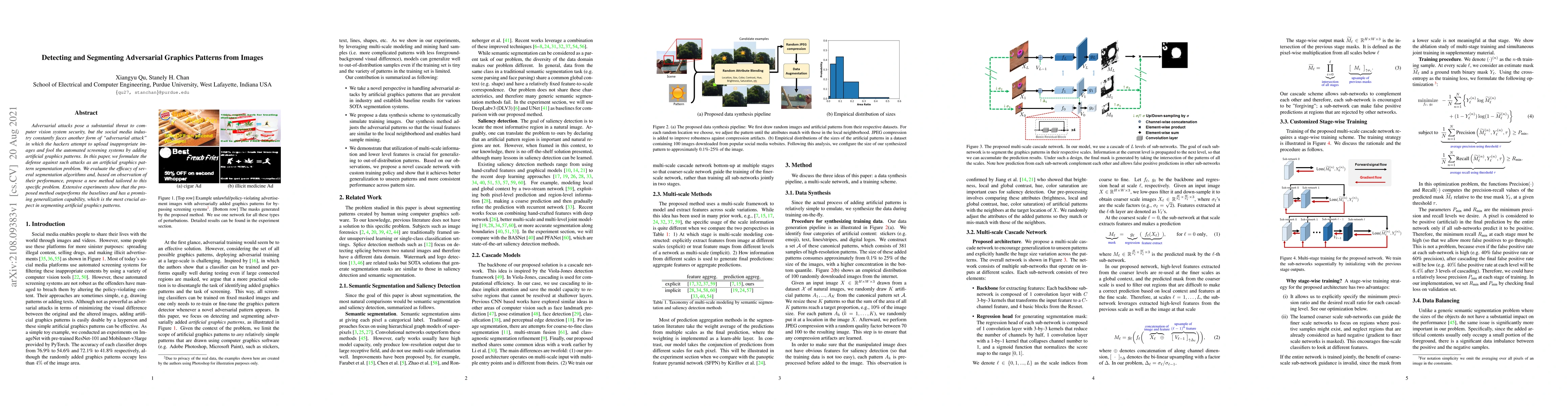 Adversarial attacks pose a substantial threat to computer vision system security, but the social media industry constantly faces another form of "adversarial attack" in which the hackers attempt to upload inappropriate images and fool the automated screening systems by adding artificial graphics patterns. In this paper, we formulate the defense against such attacks as an artificial graphics pattern segmentation problem. We evaluate the efficacy of several segmentation algorithms and, based on observation of their performance, propose a new method tailored to this specific problem. Extensive experiments show that the proposed method outperforms the baselines and has a promising generalization capability, which is the most crucial aspect in segmenting artificial graphics patterns.