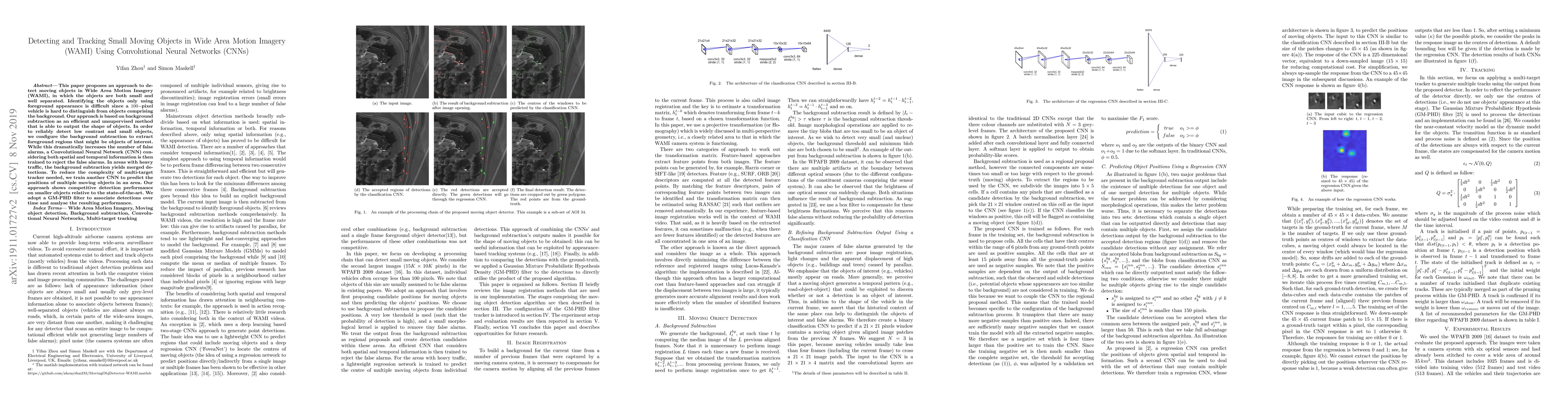 This paper proposes an approach to detect moving objects in Wide Area Motion Imagery (WAMI), in which the objects are both small and well separated. Identifying the objects only using foreground appearance is difficult since a $100-$pixel vehicle is hard to distinguish from objects comprising the background. Our approach is based on background subtraction as an efficient and unsupervised method that is able to output the shape of objects. In order to reliably detect low contrast and small objects, we configure the background subtraction to extract foreground regions that might be objects of interest. While this dramatically increases the number of false alarms, a Convolutional Neural Network (CNN) considering both spatial and temporal information is then trained to reject the false alarms. In areas with heavy traffic, the background subtraction yields merged detections. To reduce the complexity of multi-target tracker needed, we train another CNN to predict the positions of multiple moving objects in an area. Our approach shows competitive detection performance on smaller objects relative to the state-of-the-art. We adopt a GM-PHD filter to associate detections over time and analyse the resulting performance.