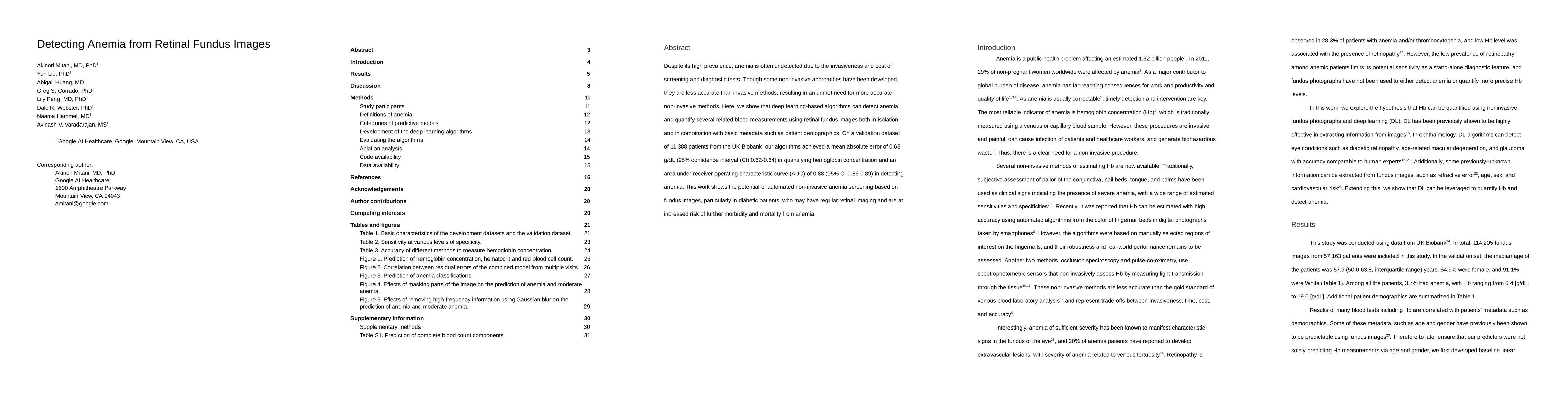 This paper demonstrates that deep learning algorithms can accurately detect anemia and quantify hemoglobin levels using retinal fundus images, achieving a mean absolute error of 0.63 g/dL and an AUC of 0.88. This non-invasive method offers a promising alternative for widespread anemia screening, especially in diabetic patients.