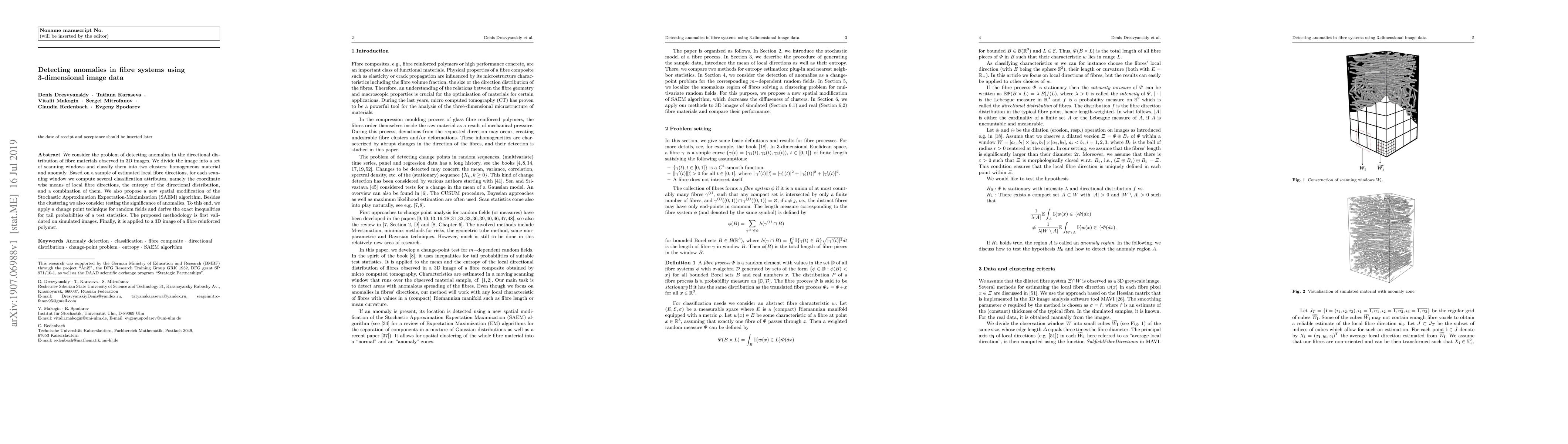 We consider the problem of detecting anomalies in the directional distribution of fibre materials observed in 3D images. We divide the image into a set of scanning windows and classify them into two clusters: homogeneous material and anomaly. Based on a sample of estimated local fibre directions, for each scanning window we compute several classification attributes, namely the coordinate wise means of local fibre directions, the entropy of the directional distribution, and a combination of them. We also propose a new spatial modification of the Stochastic Approximation Expectation-Maximization (SAEM) algorithm. Besides the clustering we also consider testing the significance of anomalies. To this end, we apply a change point technique for random fields and derive the exact inequalities for tail probabilities of a test statistics. The proposed methodology is first validated on simulated images. Finally, it is applied to a 3D image of a fibre reinforced polymer.