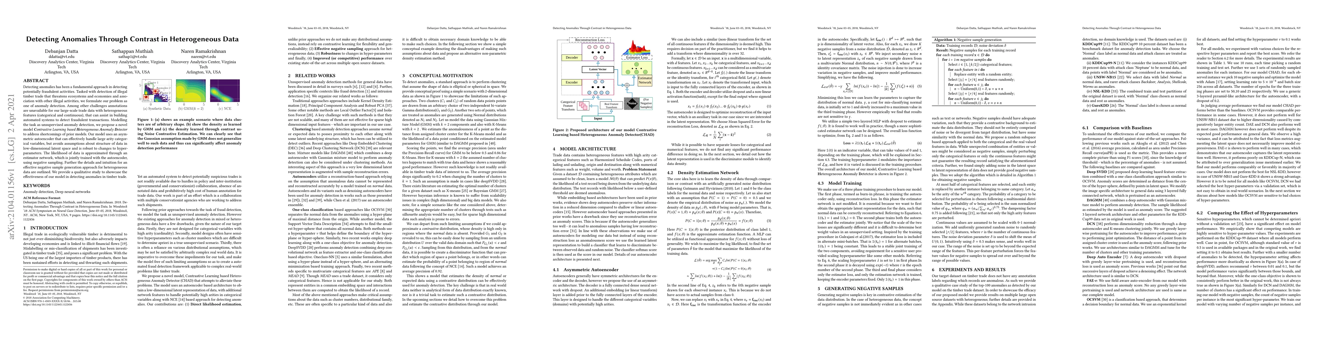 This paper proposes a Contrastive Learning based Heterogeneous Anomaly Detector for detecting fraudulent illegal timber trade in large-scale data with heterogeneous features. The model uses an asymmetric autoencoder to handle categorical variables and is robust to hyperparameter changes, while an estimator network approximates data likelihood through negative sampling.
