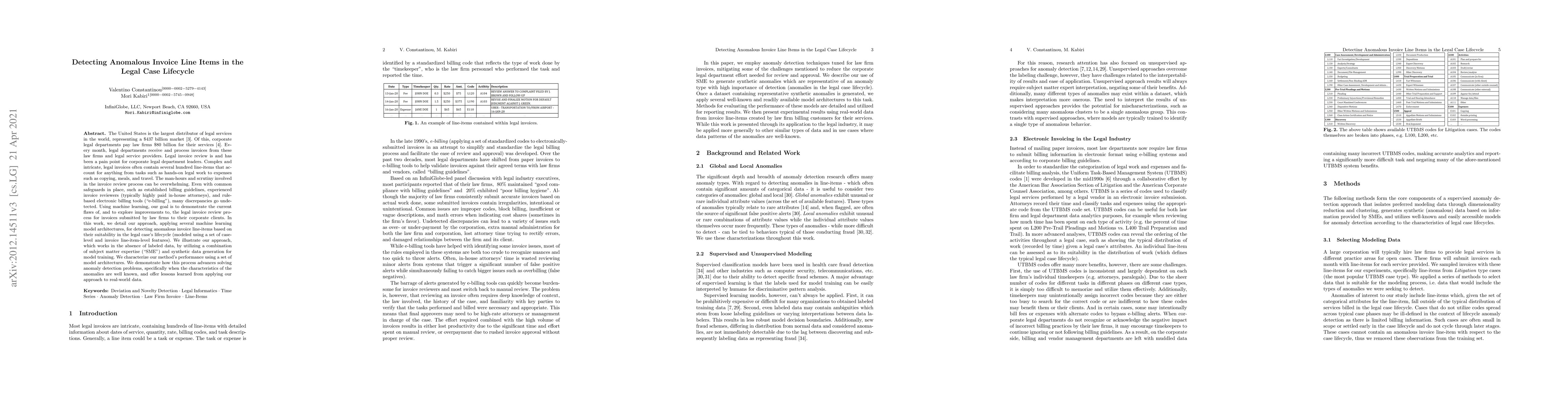 This paper explores the use of machine learning to detect anomalous invoice line items in legal services, addressing the inefficiencies in the current invoice review process. The authors propose several model architectures and generate a synthetic dataset to tackle the challenge of unlabeled data, demonstrating improved anomaly detection in legal invoices.