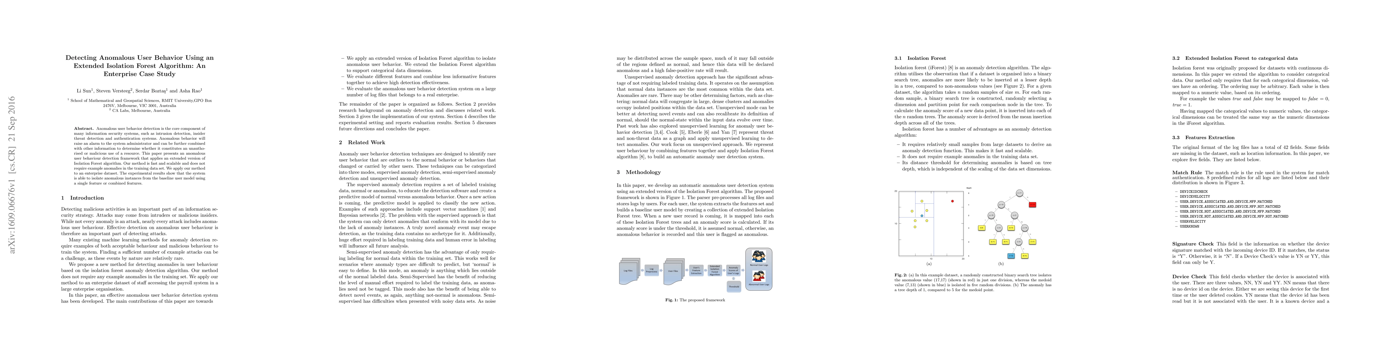 This paper proposes an extended Isolation Forest algorithm for detecting anomalous user behavior in enterprise security systems, demonstrating its effectiveness without requiring example anomalies in training data. Experimental results on an enterprise dataset show the method's ability to isolate anomalies using single or combined features.