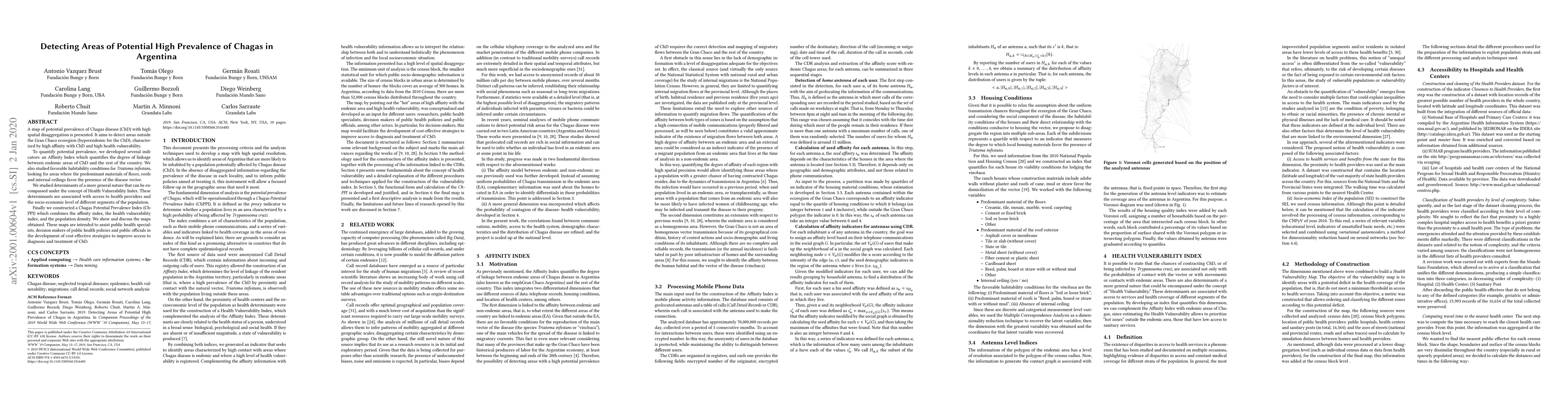 A map of potential prevalence of Chagas disease (ChD) with high spatial disaggregation is presented. It aims to detect areas outside the Gran Chaco ecoregion (hyperendemic for the ChD), characterized by high affinity with ChD and high health vulnerability. To quantify potential prevalence, we developed several indicators: an Affinity Index which quantifies the degree of linkage between endemic areas of ChD and the rest of the country. We also studied favorable habitability conditions for Triatoma infestans, looking for areas where the predominant materials of floors, roofs and internal ceilings favor the presence of the disease vector. We studied determinants of a more general nature that can be encompassed under the concept of Health Vulnerability Index. These determinants are associated with access to health providers and the socio-economic level of different segments of the population. Finally we constructed a Chagas Potential Prevalence Index (ChPPI) which combines the affinity index, the health vulnerability index, and the population density. We show and discuss the maps obtained. These maps are intended to assist public health specialists, decision makers of public health policies and public officials in the development of cost-effective strategies to improve access to diagnosis and treatment of ChD.