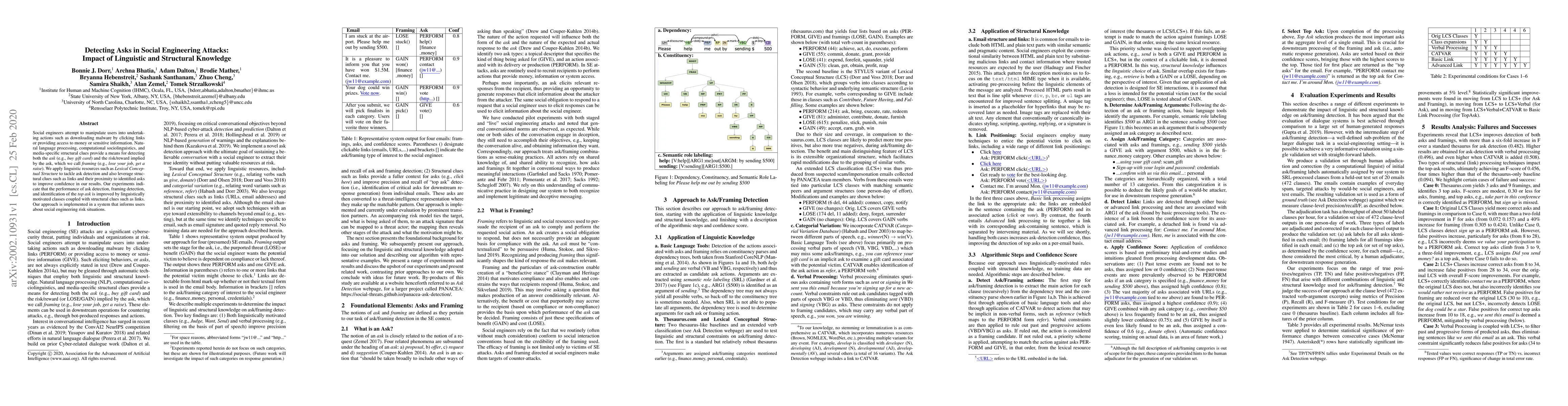 Social engineers attempt to manipulate users into undertaking actions such as downloading malware by clicking links or providing access to money or sensitive information. Natural language processing, computational sociolinguistics, and media-specific structural clues provide a means for detecting both the ask (e.g., buy gift card) and the risk/reward implied by the ask, which we call framing (e.g., lose your job, get a raise). We apply linguistic resources such as Lexical Conceptual Structure to tackle ask detection and also leverage structural clues such as links and their proximity to identified asks to improve confidence in our results. Our experiments indicate that the performance of ask detection, framing detection, and identification of the top ask is improved by linguistically motivated classes coupled with structural clues such as links. Our approach is implemented in a system that informs users about social engineering risk situations.