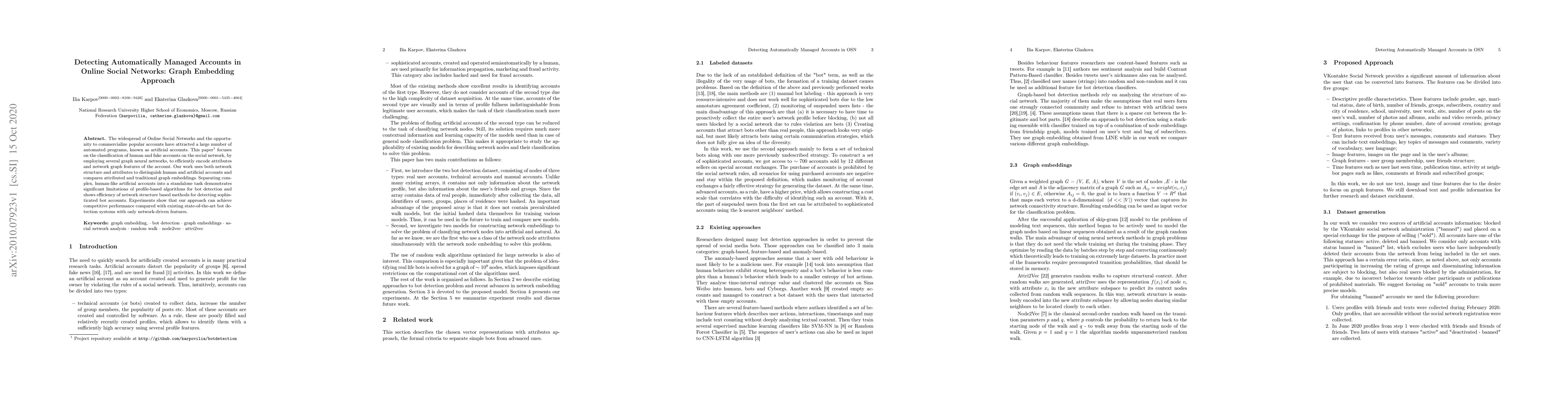 The widespread of Online Social Networks and the opportunity to commercialize popular accounts have attracted a large number of automated programs, known as artificial accounts. This paper focuses on the classification of human and fake accounts on the social network, by employing several graph neural networks, to efficiently encode attributes and network graph features of the account. Our work uses both network structure and attributes to distinguish human and artificial accounts and compares attributed and traditional graph embeddings. Separating complex, human-like artificial accounts into a standalone task demonstrates significant limitations of profile-based algorithms for bot detection and shows the efficiency of network structure-based methods for detecting sophisticated bot accounts. Experiments show that our approach can achieve competitive performance compared with existing state-of-the-art bot detection systems with only network-driven features. The source code of this paper is available at: http://github.com/karpovilia/botdetection.