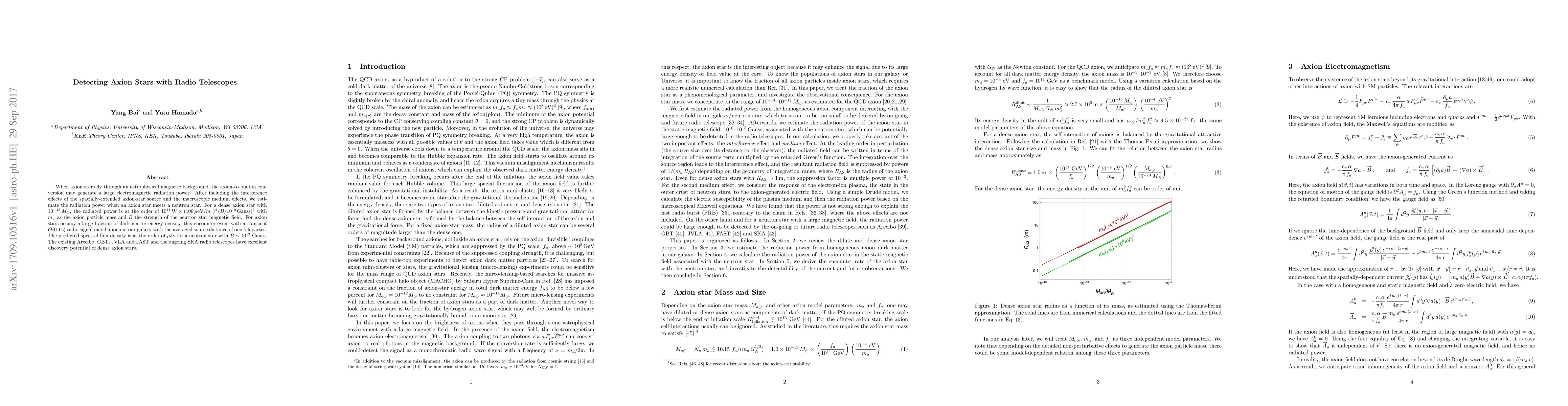 This paper estimates the electromagnetic radiation power generated when axion stars interact with neutron stars, predicting a transient radio signal detectable by current and future radio telescopes. The predicted spectral flux density is on the order of micro-Jansky, indicating significant potential for detecting dense axion stars with instruments like Arecibo, GBT, JVLA, FAST, and the upcoming SKA.