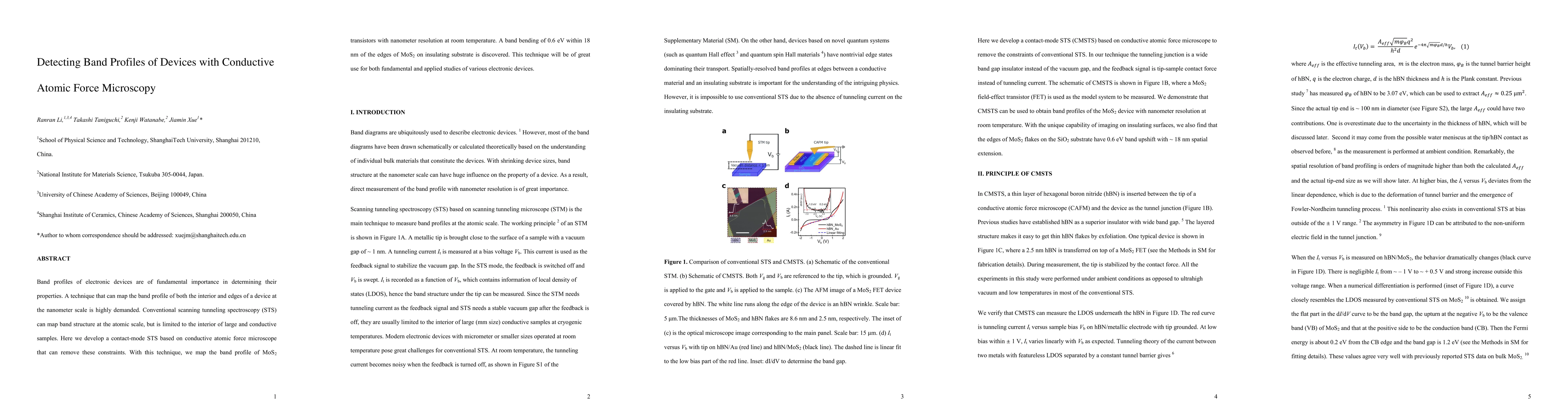 Band profiles of electronic devices are of fundamental importance in determining their properties. A technique that can map the band profile of both the interior and edges of a device at the nanometer scale is highly demanded. Conventional scanning tunneling spectroscopy (STS) can map band structure at the atomic scale, but is limited to the interior of large and conductive samples. Here we develop a contact-mode STS based on conductive atomic force microscope that can remove these constraints. With this technique, we map the band profile of MoS$_2$ transistors with nanometer resolution at room temperature. A band bending of 0.6 eV within 18 nm of the edges of MoS$_2$ on insulating substrate is discovered. This technique will be of great use for both fundamental and applied studies of various electronic devices.