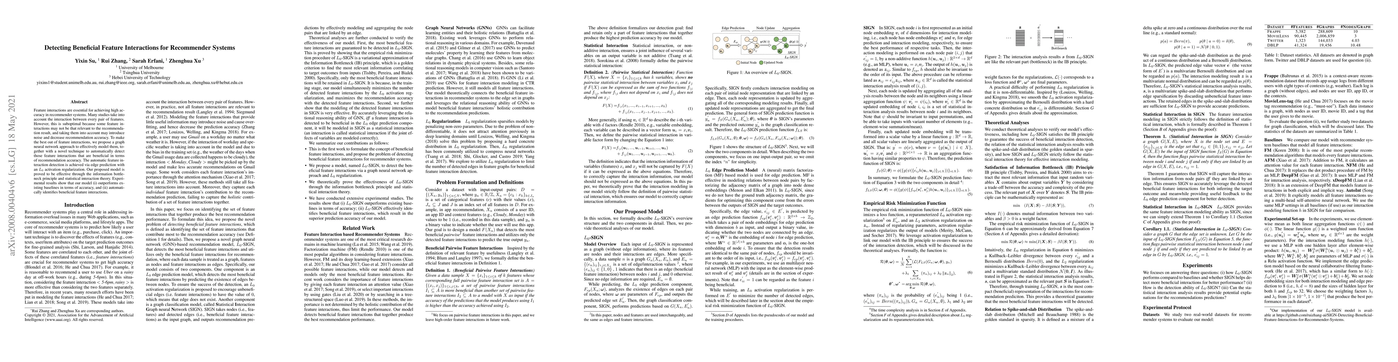This paper proposes a graph neural network approach to model and detect beneficial feature interactions in recommender systems, using an L0 activation regularization technique for automatic detection. Experimental results demonstrate improved accuracy and effective identification of beneficial interactions compared to existing methods.