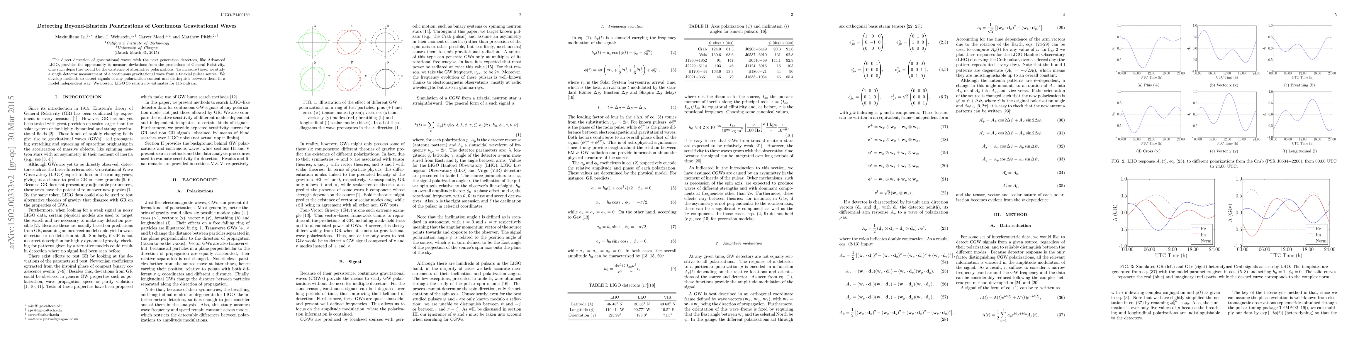 The direct detection of gravitational waves with the next generation detectors, like Advanced LIGO, provides the opportunity to measure deviations from the predictions of General Relativity. One such departure would be the existence of alternative polarizations. To measure these, we study a single detector measurement of a continuous gravitational wave from a triaxial pulsar source. We develop methods to detect signals of any polarization content and distinguish between them in a model independent way. We present LIGO S5 sensitivity estimates for 115 pulsars.