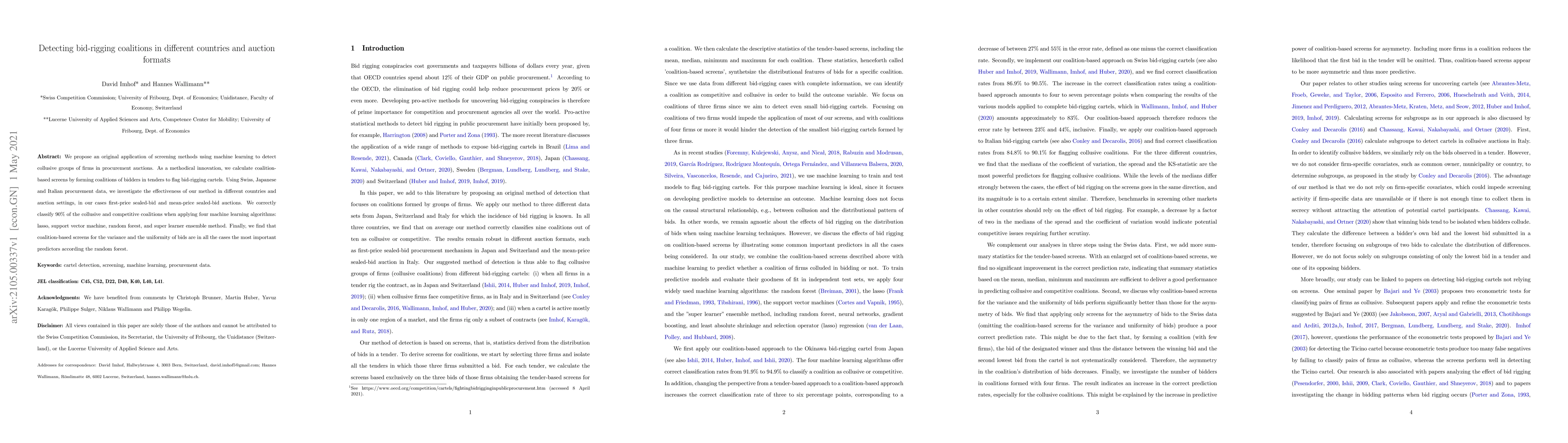 This paper introduces a machine learning approach to detect collusive groups in procurement auctions, using coalition-based screens to identify bid-rigging. The method is tested across Swiss, Japanese, and Italian data in different auction formats, achieving 90% accuracy in classifying collusive and competitive coalitions.