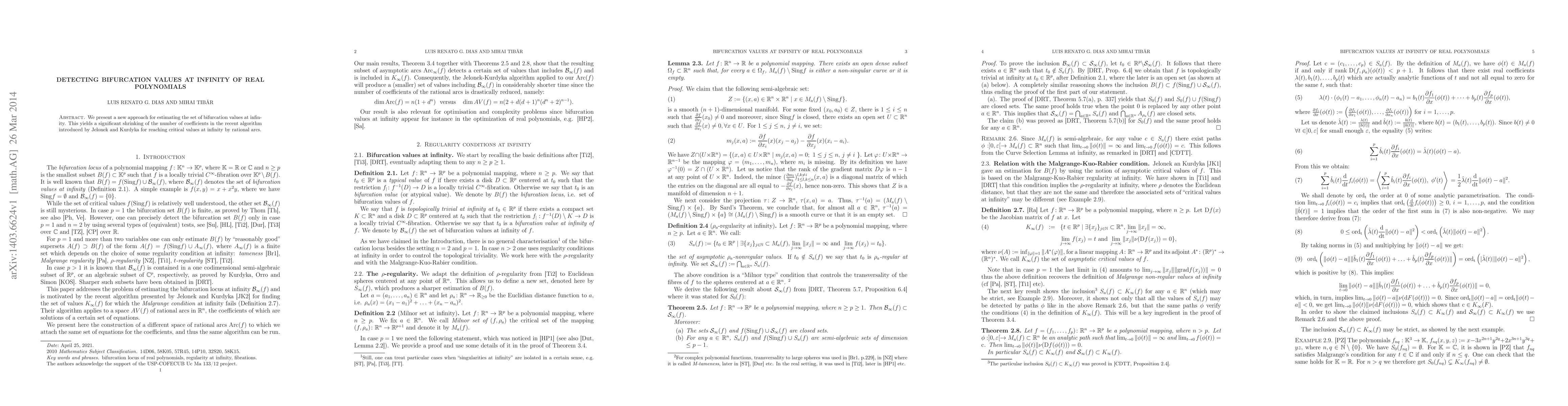 Summary: This paper introduces a novel method to estimate bifurcation values at infinity for real polynomials, significantly reducing the coefficient requirements compared to the previous algorithm by Jelonek and Kurdyka.