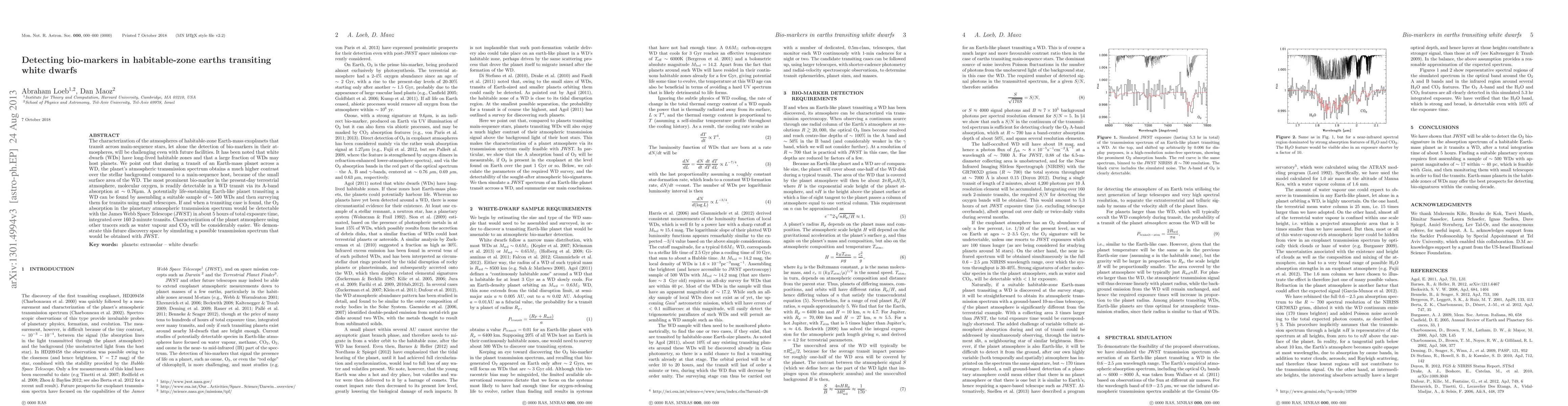 This paper explores the potential for detecting bio-markers in Earth-sized planets transiting white dwarfs, noting the higher contrast of the planet's atmosphere against the small, dim white dwarf's background. The study suggests that molecular oxygen could be detected via its A-band absorption, and that a sample of around 500 white dwarfs could be surveyed to find such planets, with the James Webb Space Telescope capable of confirming these findings.