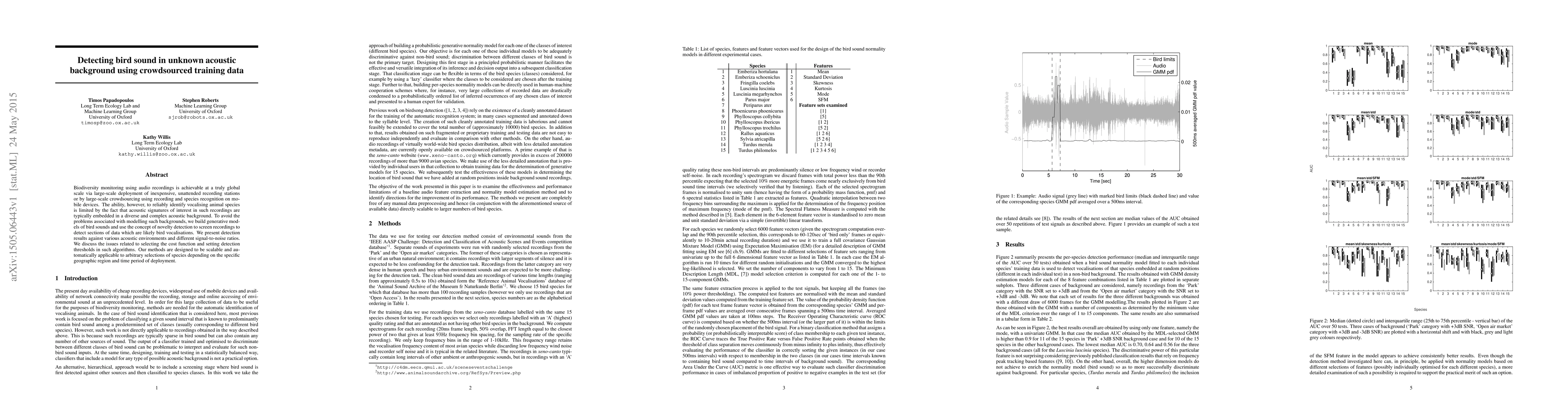 This paper proposes a method for detecting bird sounds in complex acoustic backgrounds using crowdsourced training data. The approach leverages generative models and novelty detection to identify likely bird vocalizations, demonstrating scalability and adaptability across different species and environments.