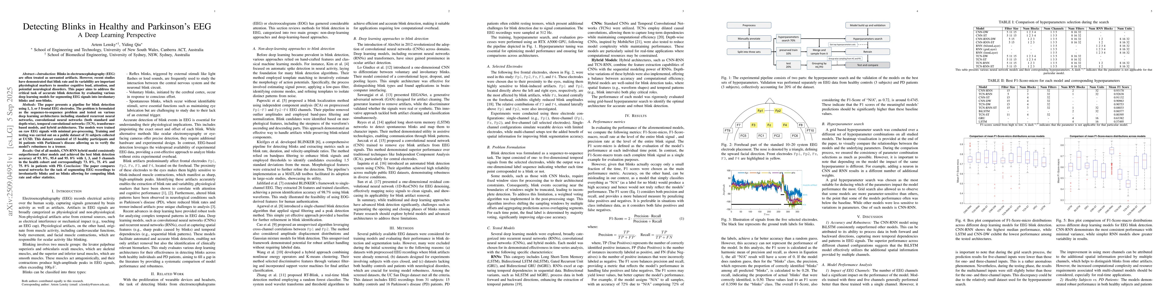Blinks in electroencephalography (EEG) are often treated as unwanted artifacts. However, recent studies have demonstrated that blink rate and its variability are important physiological markers to monitor cognitive load, attention, and potential neurological disorders. This paper addresses the critical task of accurate blink detection by evaluating various deep learning models for segmenting EEG signals into involuntary blinks and non-blinks. We present a pipeline for blink detection using 1, 3, or 5 frontal EEG electrodes. The problem is formulated as a sequence-to-sequence task and tested on various deep learning architectures including standard recurrent neural networks, convolutional neural networks (both standard and depth-wise), temporal convolutional networks (TCN), transformer-based models, and hybrid architectures. The models were trained on raw EEG signals with minimal pre-processing. Training and testing was carried out on a public dataset of 31 subjects collected at UCSD. This dataset consisted of 15 healthy participants and 16 patients with Parkinson's disease allowing us to verify the model's robustness to tremor. Out of all models, CNN-RNN hybrid model consistently outperformed other models and achieved the best blink detection accuracy of 93.8%, 95.4% and 95.8% with 1, 3, and 5 channels in the healthy cohort and correspondingly 73.8%, 75.4% and 75.8% in patients with PD. The paper compares neural networks for the task of segmenting EEG recordings to involuntary blinks and no blinks allowing for computing blink rate and other statistics.