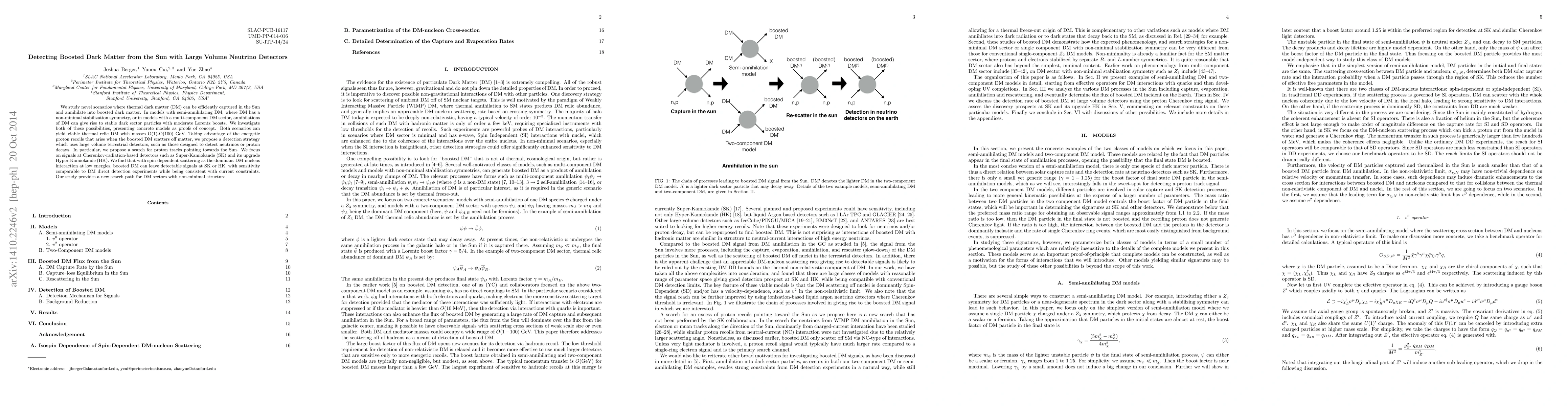 This paper explores novel dark matter (DM) models where DM can be captured in the Sun and annihilate into boosted particles, proposing a detection strategy using large volume neutrino detectors. It finds that these boosted DM particles can produce detectable signals in detectors like Super-Kamiokande and Hyper-Kamiokande, offering a new search path for DM with non-minimal structures.