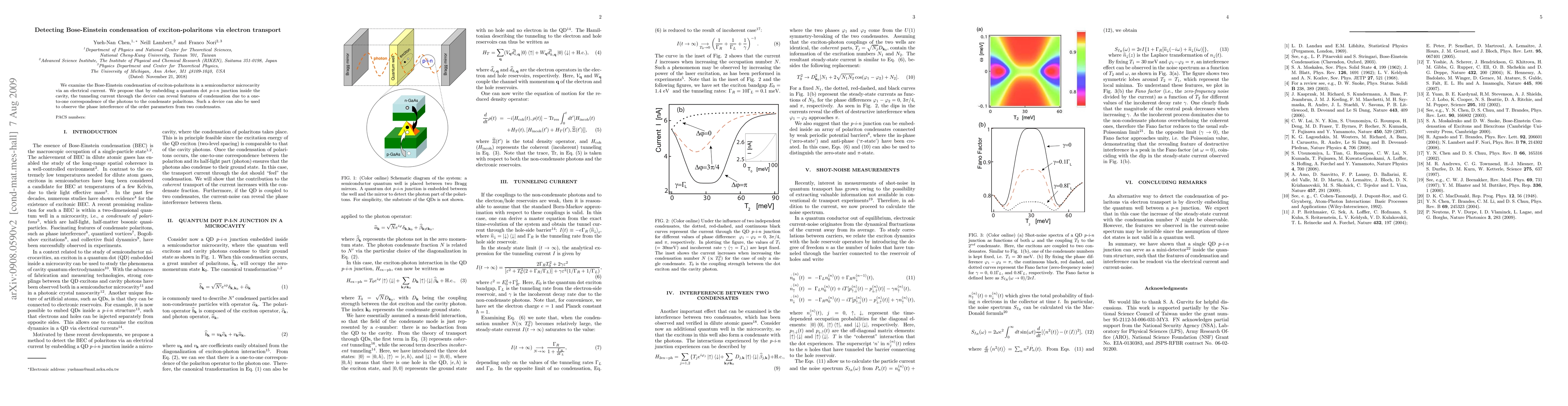 This research investigates the detection of Bose-Einstein condensation of exciton-polaritons using an electrical current by embedding a quantum dot p-i-n junction in a semiconductor microcavity. The tunneling current is proposed to reveal condensation features, allowing observation of phase interference between two condensates.