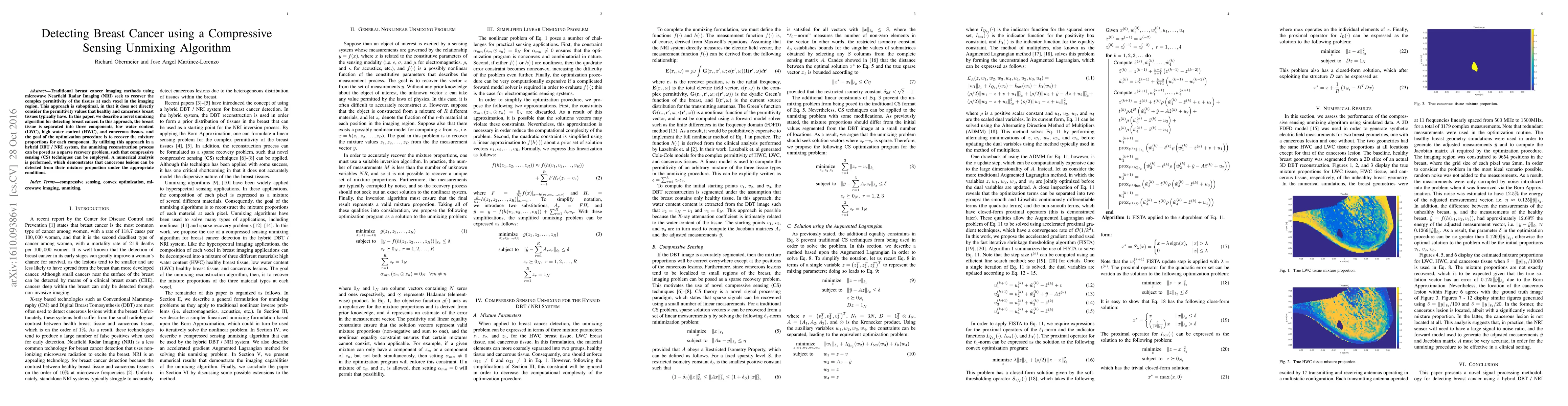 Traditional breast cancer imaging methods using microwave Nearfield Radar Imaging (NRI) seek to recover the complex permittivity of the tissues at each voxel in the imaging region. This approach is suboptimal, in that it does not directly consider the permittivity values that healthy and cancerous breast tissues typically have. In this paper, we describe a novel unmixing algorithm for detecting breast cancer. In this approach, the breast tissue is separated into three components, low water content (LWC), high water content (HWC), and cancerous tissues, and the goal of the optimization procedure is to recover the mixture proportions for each component. By utilizing this approach in a hybrid DBT / NRI system, the unmixing reconstruction process can be posed as a sparse recovery problem, such that compressive sensing (CS) techniques can be employed. A numerical analysis is performed, which demonstrates that cancerous lesions can be detected from their mixture proportion under the appropriate conditions.