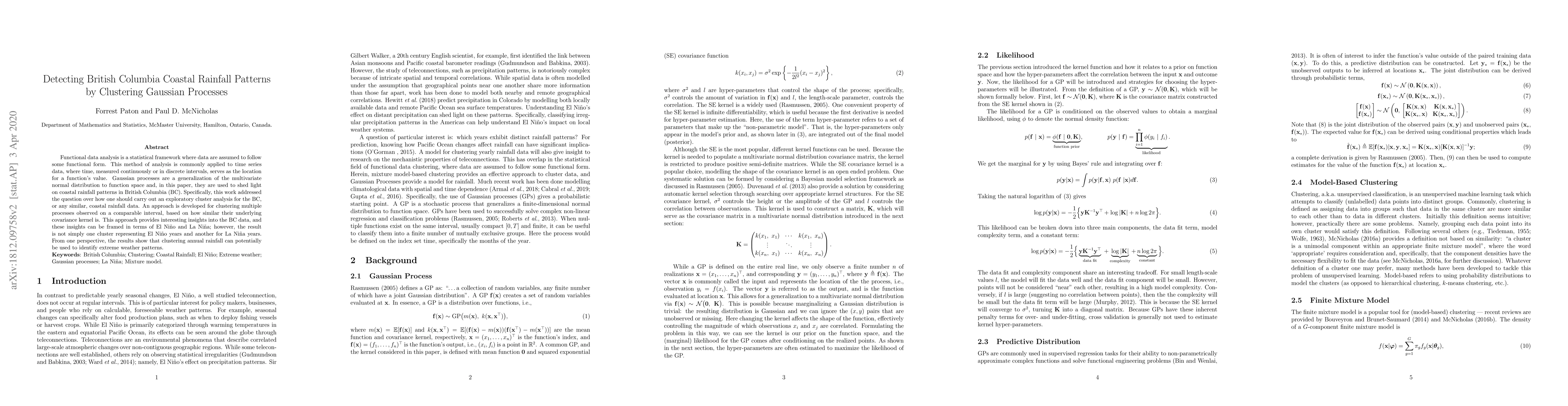 Functional data analysis is a statistical framework where data are assumed to follow some functional form. This method of analysis is commonly applied to time series data, where time, measured continuously or in discrete intervals, serves as the location for a function's value. Gaussian processes are a generalization of the multivariate normal distribution to function space and, in this paper, they are used to shed light on coastal rainfall patterns in British Columbia (BC). Specifically, this work addressed the question over how one should carry out an exploratory cluster analysis for the BC, or any similar, coastal rainfall data. An approach is developed for clustering multiple processes observed on a comparable interval, based on how similar their underlying covariance kernel is. This approach provides interesting insights into the BC data, and these insights can be framed in terms of El Ni\~{n}o and La Ni\~{n}a; however, the result is not simply one cluster representing El Ni\~{n}o years and another for La Ni\~{n}a years. From one perspective, the results show that clustering annual rainfall can potentially be used to identify extreme weather patterns.
