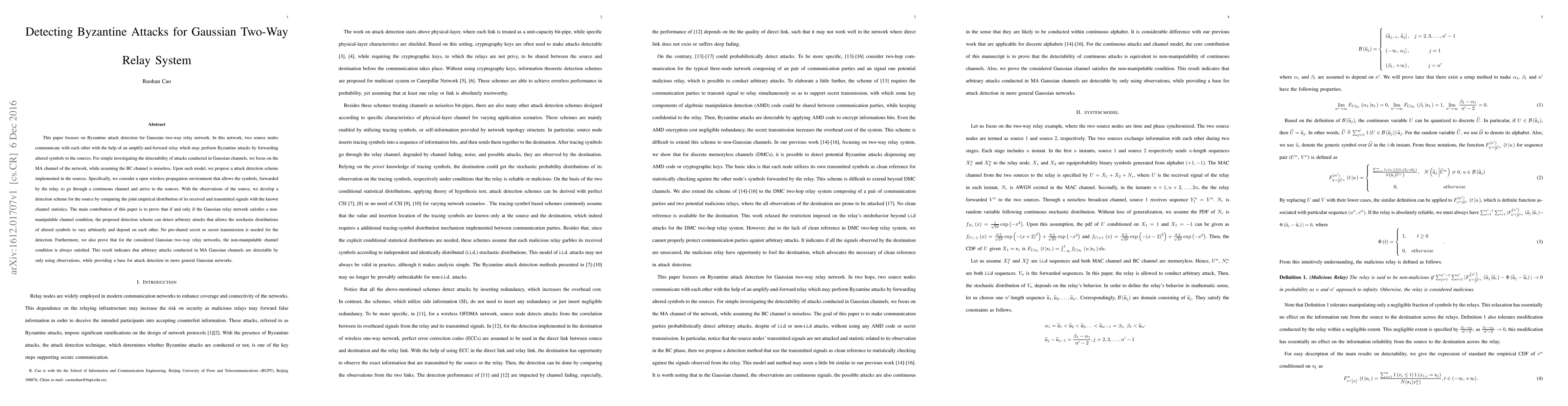 This paper focuses on Byzantine attack detection for Gaussian two-way relay network. In this network, two source nodes communicate with each other with the help of an amplify-and-forward relay which may perform Byzantine attacks by forwarding altered symbols to the sources. For simple investigating the detectability of attacks conducted in Gaussian channels, we focus on the MA channel of the network, while assuming the BC channel is noiseless. Upon such model, we propose a attack detection scheme implemented in the sources. Specifically, we consider a open wireless propagation environment that allows the symbols, forwarded by the relay, to go through a continuous channel and arrive to the sources. With the observations of the source, we develop a detection scheme for the source by comparing the joint empirical distribution of its received and transmitted signals with the known channel statistics. The main contribution of this paper is to prove that if and only if the Gaussian relay network satisfies a non-manipulable channel condition, the proposed detection scheme can detect arbitrary attacks that allows the stochastic distributions of altered symbols to vary arbitrarily and depend on each other. No pre-shared secret or secret transmission is needed for the detection. Furthermore, we also prove that for the considered Gaussian two-way relay networks, the non-manipulable channel condition is always satisfied. This result indicates that arbitrary attacks conducted in MA Gaussian channels are detectable by only using observations, while providing a base for attack detection in more general Gaussian networks.