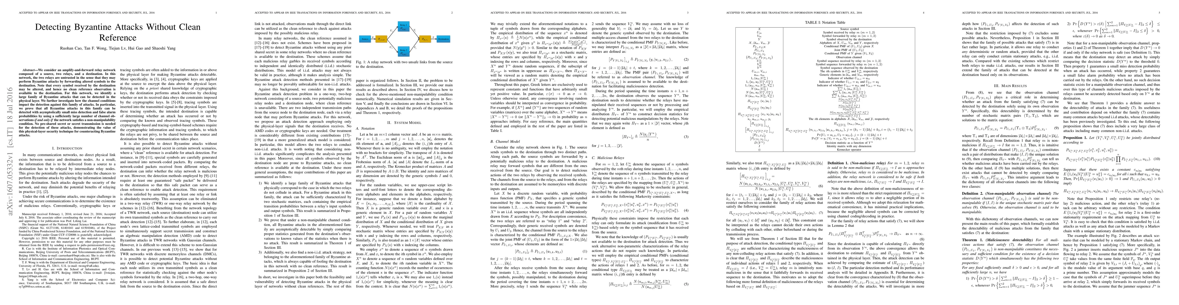 This paper proposes a method to detect Byzantine attacks in an amplify-and-forward relay network without relying on clean reference observations. It demonstrates that under certain conditions, a large family of Byzantine attacks can be detected with high reliability through physical-layer security techniques, without requiring pre-shared secrets.