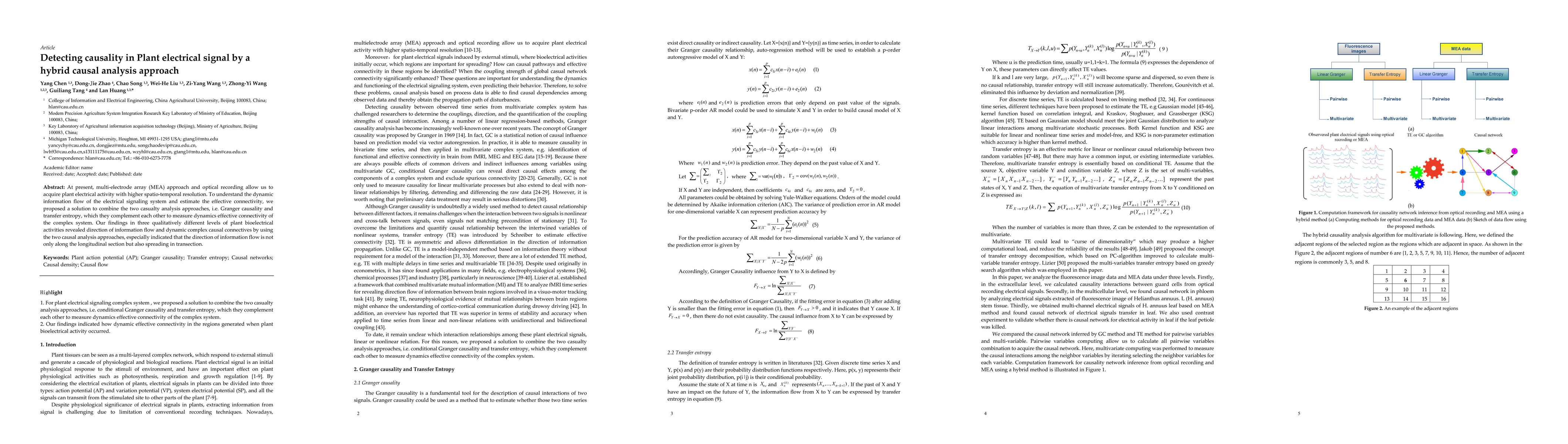 At present, multi-electrode array (MEA) approach and optical recording allow us to acquire plant electrical activity with higher spatio-temporal resolution. To understand the dynamic information flow of the electrical signaling system and estimate the effective connectivity, we proposed a solution to combine the two casualty analysis approaches, i.e. Granger causality and transfer entropy, which they complement each other to measure dynamics effective connectivity of the complex system. Our findings in three qualitatively different levels of plant bioelectrical activities revealed direction of information flow and dynamic complex causal connectives by using the two causal analysis approaches, especially indicated that the direction of information flow is not only along the longitudinal section but also spreading in transection.