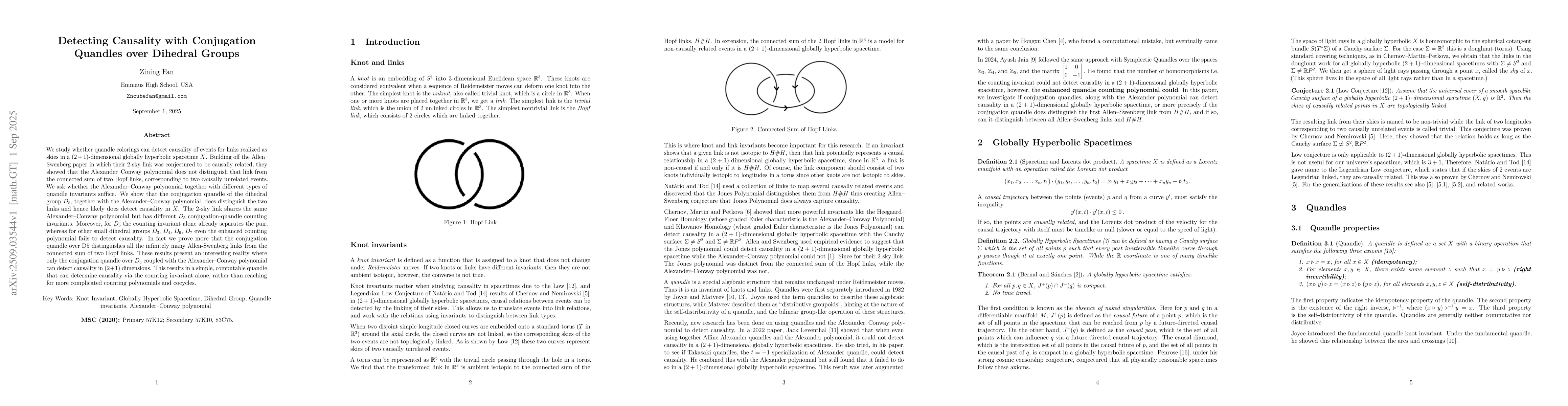 We study whether quandle colorings can detect causality of events for links realized as skies in a $(2+1)$-dimensional globally hyperbolic spacetime $X$. Building off the Allen--Swenberg paper in which their $2$-sky link was conjectured to be causally related, they showed that the Alexander--Conway polynomial does not distinguish that link from the connected sum of two Hopf links, corresponding to two causally unrelated events. We ask whether the Alexander--Conway polynomial together with different types of quandle invariants suffice. We show that the conjugation quandle of the dihedral group $D_5$, together with the Alexander--Conway polynomial, does distinguish the two links and hence likely does detect causality in $X$. The $2$-sky link shares the same Alexander--Conway polynomial but has different $D_5$ conjugation-quandle counting invariants. Moreover, for $D_5$ the counting invariant alone already separates the pair, whereas for other small dihedral groups $D_3$, $D_4$, $D_6$, $D_7$ even the enhanced counting polynomial fails to detect causality. In fact we prove more that the conjugation quandle over D5 distinguishes all the infinitely many Allen-Swenberg links from the connected sum of two Hopf links. These results present an interesting reality where only the conjugation quandle over $D_5$ coupled with the Alexander--Conway polynomial can detect causality in $(2+1)$ dimensions. This results in a simple, computable quandle that can determine causality via the counting invariant alone, rather than reaching for more complicated counting polynomials and cocycles.