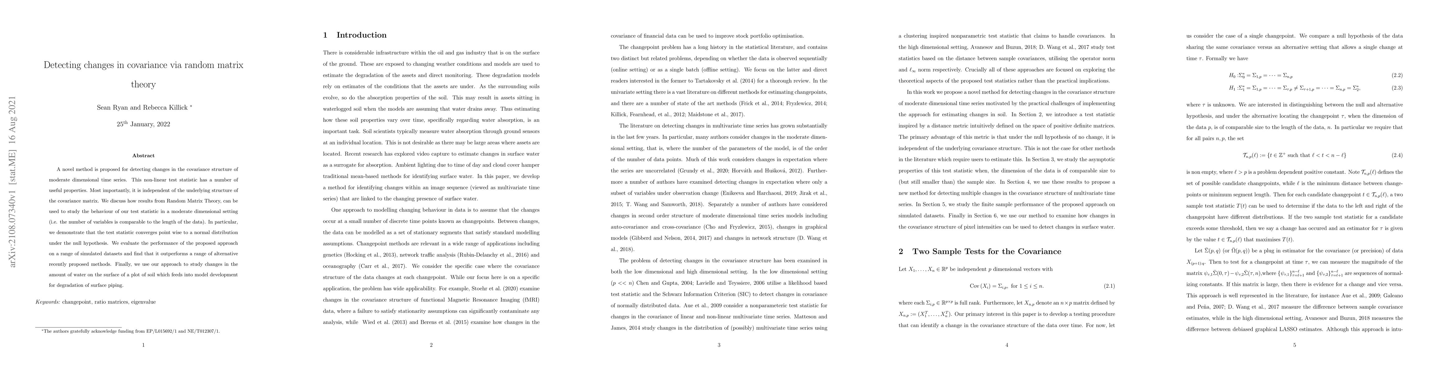 A new method detects changes in covariance structure using random matrix theory, outperforming existing methods on simulated datasets, and has properties that make it useful for studying moderate-dimensional time series.
