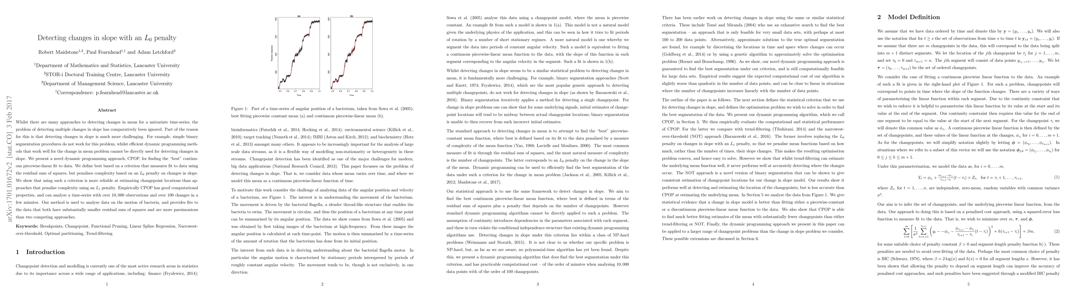 This paper introduces CPOP, a novel dynamic programming method for detecting multiple changes in slope in univariate time-series data, using an $L_0$ penalty for complexity control. It demonstrates that CPOP outperforms $L_1$ penalty methods and efficiently handles large datasets with numerous changepoints.