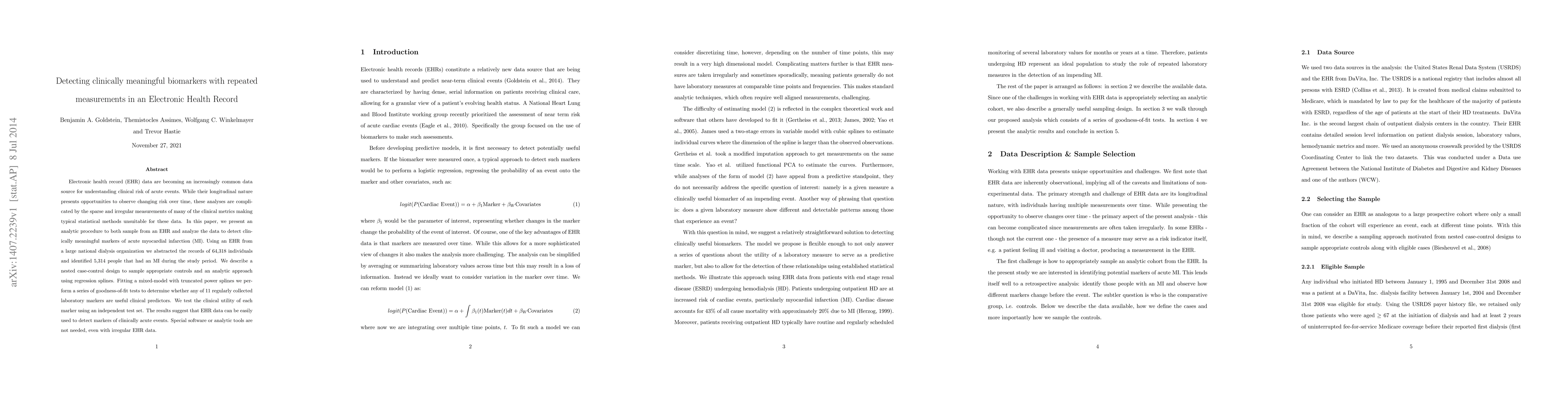 Electronic health record (EHR) data are becoming an increasingly common data source for understanding clinical risk of acute events. While their longitudinal nature presents opportunities to observe changing risk over time, these analyses are complicated by the sparse and irregular measurements of many of the clinical metrics making typical statistical methods unsuitable for these data. In this paper, we present an analytic procedure to both sample from an EHR and analyze the data to detect clinically meaningful markers of acute myocardial infarction (MI). Using an EHR from a large national dialysis organization we abstracted the records of 64,318 individuals and identified 5,314 people that had an MI during the study period. We describe a nested case-control design to sample appropriate controls and an analytic approach using regression splines. Fitting a mixed-model with truncated power splines we perform a series of goodness-of-fit tests to determine whether any of 11 regularly collected laboratory markers are useful clinical predictors. We test the clinical utility of each marker using an independent test set. The results suggest that EHR data can be easily used to detect markers of clinically acute events. Special software or analytic tools are not needed, even with irregular EHR data.