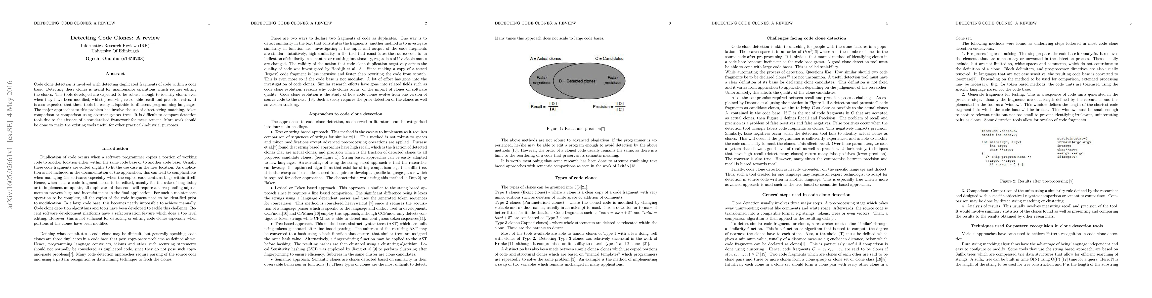 This paper reviews code clone detection methods, highlighting the use of string matching, token comparison, and abstract syntax trees. It emphasizes the need for robust tools adaptable to various programming languages and calls for a standardized framework to evaluate these tools for practical applications.