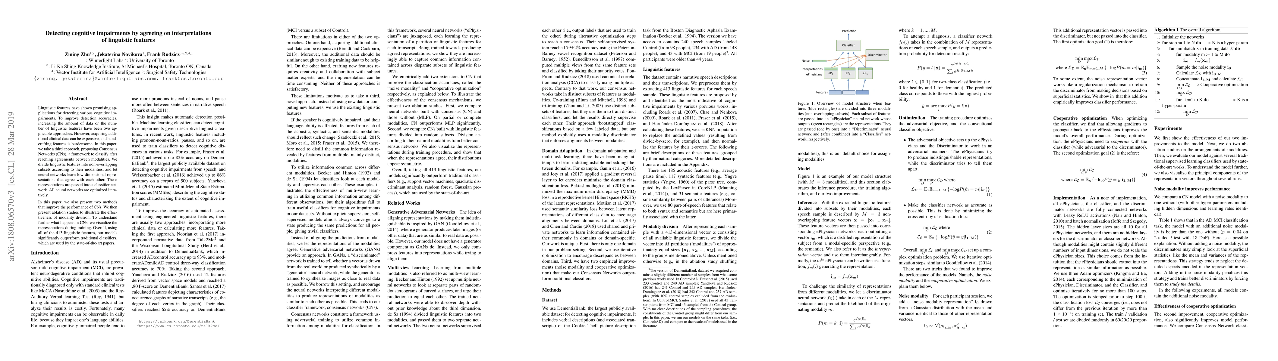 This paper proposes Consensus Networks (CNs) to detect cognitive impairments by leveraging agreements between different modalities of linguistic features. The framework divides linguistic features into subsets and trains neural networks to learn representations that agree with each other, which are then used for classification. The study demonstrates that CNs outperform traditional classifiers using all 413 linguistic features.