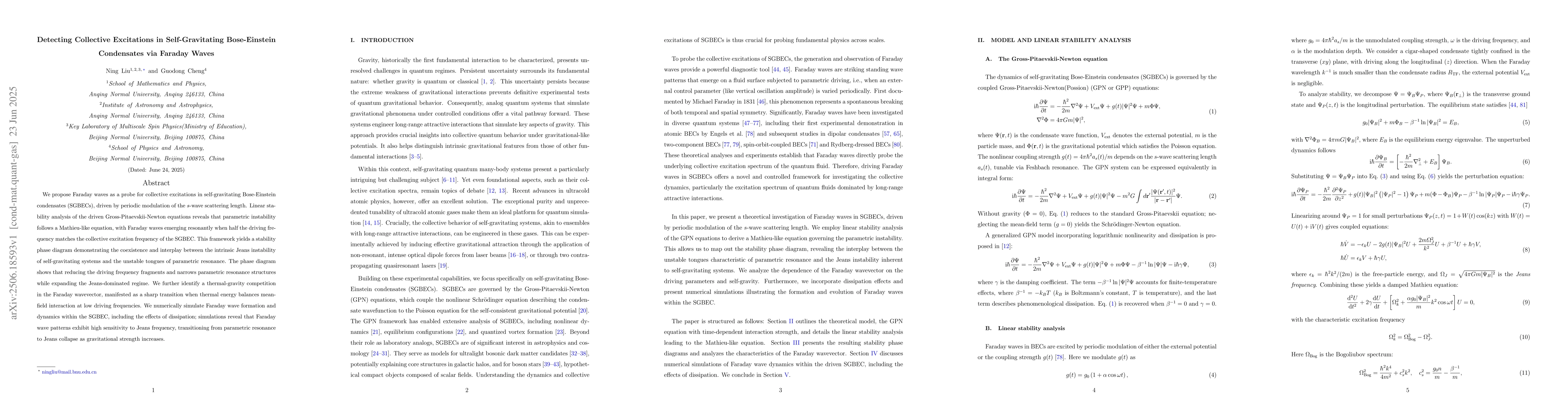 We propose Faraday waves as a probe for collective excitations in self-gravitating Bose-Einstein condensates (SGBECs), driven by periodic modulation of the $s$-wave scattering length. Linear stability analysis of the driven Gross-Pitaevskii-Newton equations reveals that parametric instability follows a Mathieu-like equation, with Faraday waves emerging resonantly when half the driving frequency matches the collective excitation frequency of the SGBEC. This framework yields a stability phase diagram demonstrating the coexistence and interplay between the intrinsic Jeans instability of self-gravitating systems and the unstable tongues of parametric resonance. The phase diagram shows that reducing the driving frequency fragments and narrows parametric resonance structures while expanding the Jeans-dominated regime. We further identify a thermal-gravity competition in the Faraday wavevector, manifested as a sharp transition when thermal energy balances mean-field interaction at low driving frequencies. We numerically simulate Faraday wave formation and dynamics within the SGBEC, including the effects of dissipation; simulations reveal that Faraday wave patterns exhibit high sensitivity to Jeans frequency, transitioning from parametric resonance to Jeans collapse as gravitational strength increases.