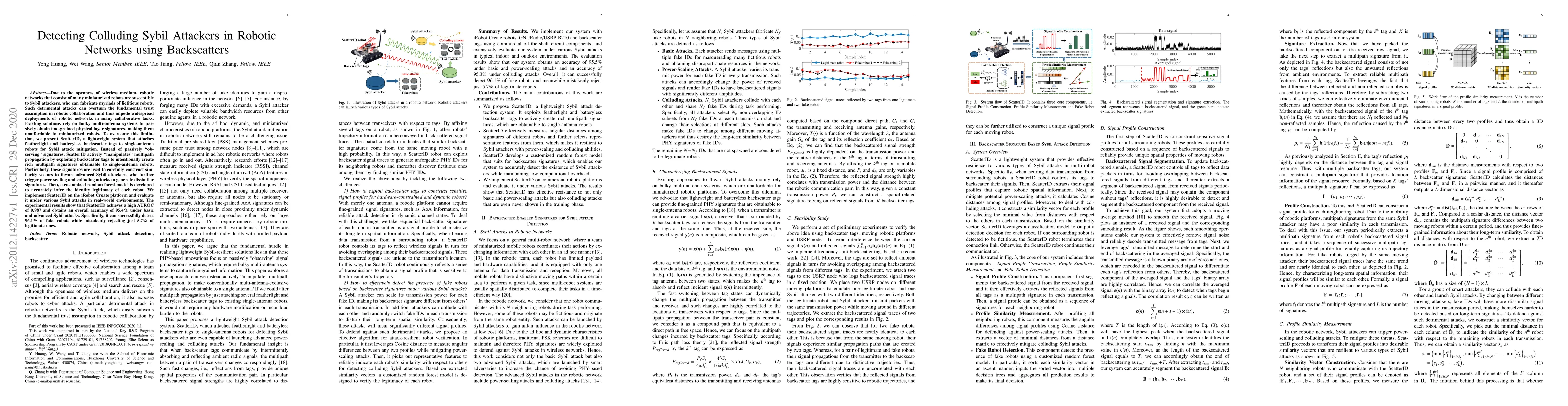 A new system called ScatterID uses lightweight backscatter tags to detect Sybil attackers in robotic networks, achieving high accuracy rates of 95.4% and 96.1% in detecting fake robots.