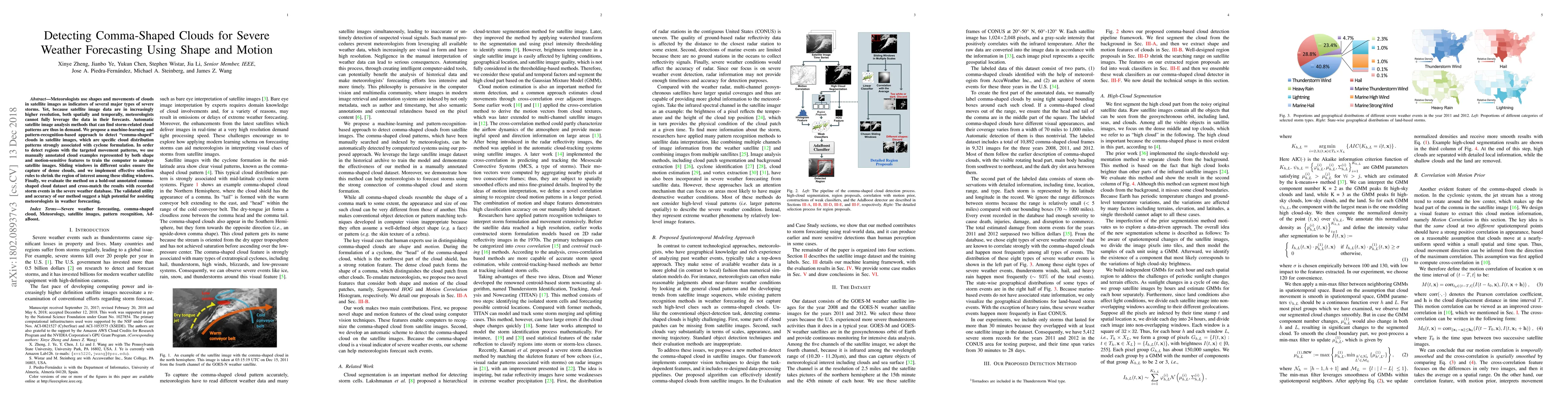 Meteorologists use shapes and movements of clouds in satellite images as indicators of several major types of severe storms. Satellite imaginary data are in increasingly higher resolution, both spatially and temporally, making it impossible for humans to fully leverage the data in their forecast. Automatic satellite imagery analysis methods that can find storm-related cloud patterns as soon as they are detectable are in demand. We propose a machine learning and pattern recognition based approach to detect "comma-shaped" clouds in satellite images, which are specific cloud distribution patterns strongly associated with the cyclone formulation. In order to detect regions with the targeted movement patterns, our method is trained on manually annotated cloud examples represented by both shape and motion-sensitive features. Sliding windows in different scales are used to ensure that dense clouds will be captured, and we implement effective selection rules to shrink the region of interest among these sliding windows. Finally, we evaluate the method on a hold-out annotated comma-shaped cloud dataset and cross-match the results with recorded storm events in the severe weather database. The validated utility and accuracy of our method suggest a high potential for assisting meteorologists in weather forecasting.